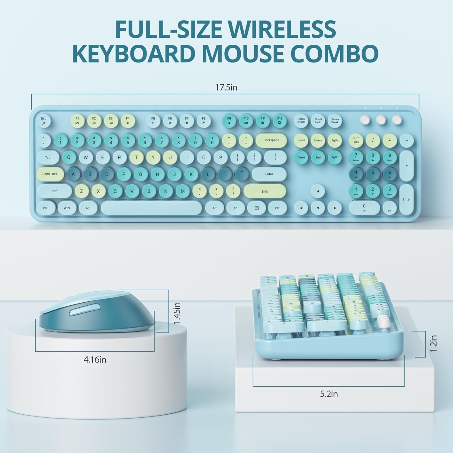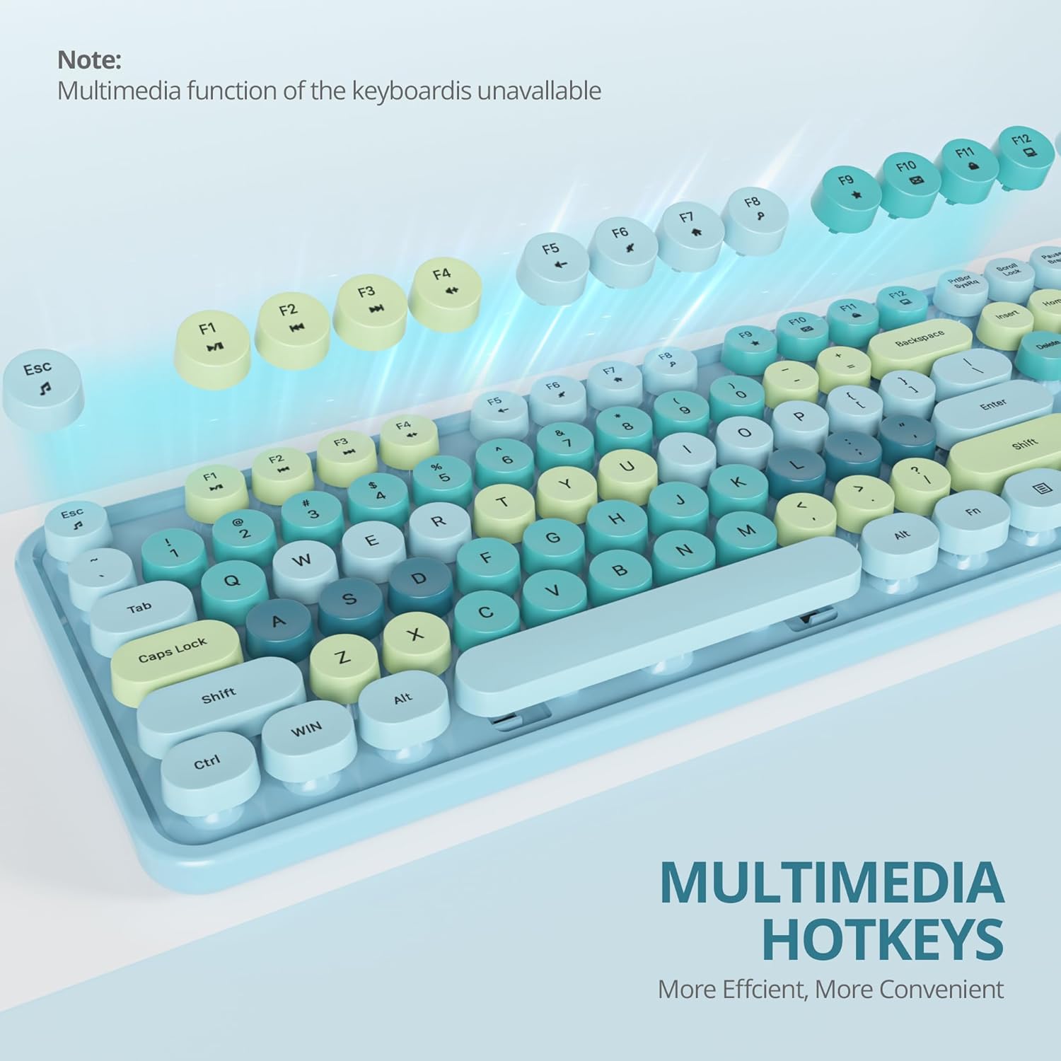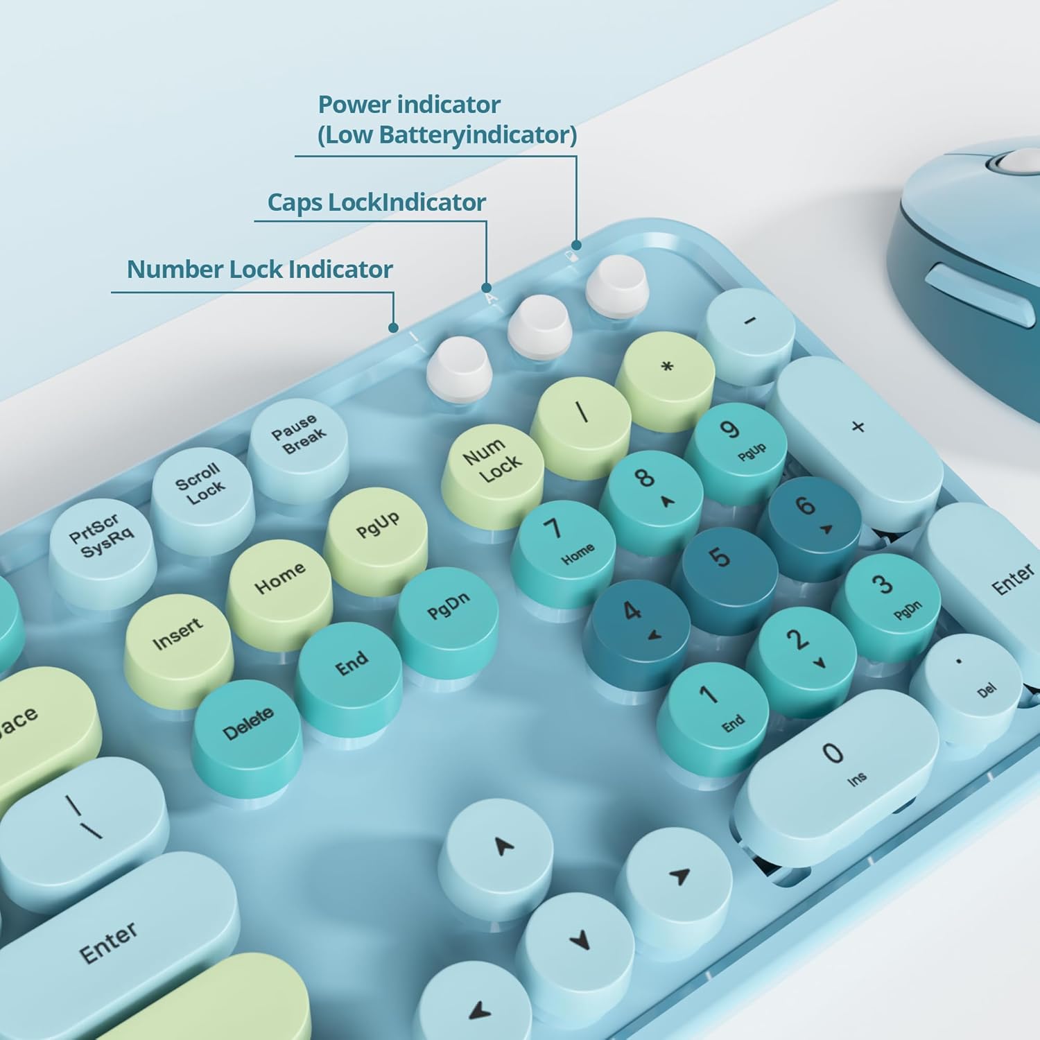 Безжична клавиатура и мишка SbocKeeb, 104 клавиатура за пишеща машина с пълен размер и цифрова клавиатура, американска QWERTY клавиатура, 2.4 GHz с ретро кръгли клавиши за компютър, цветно синьо