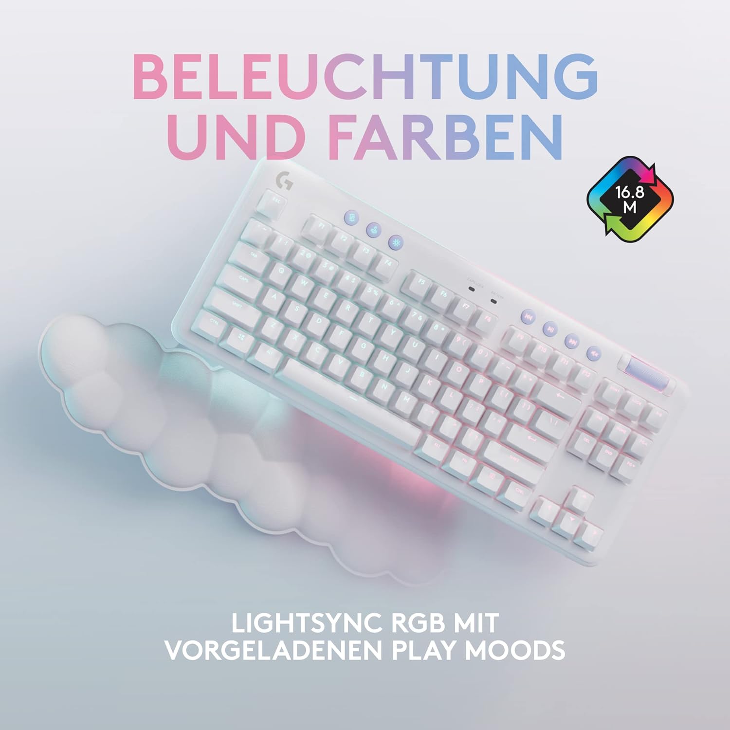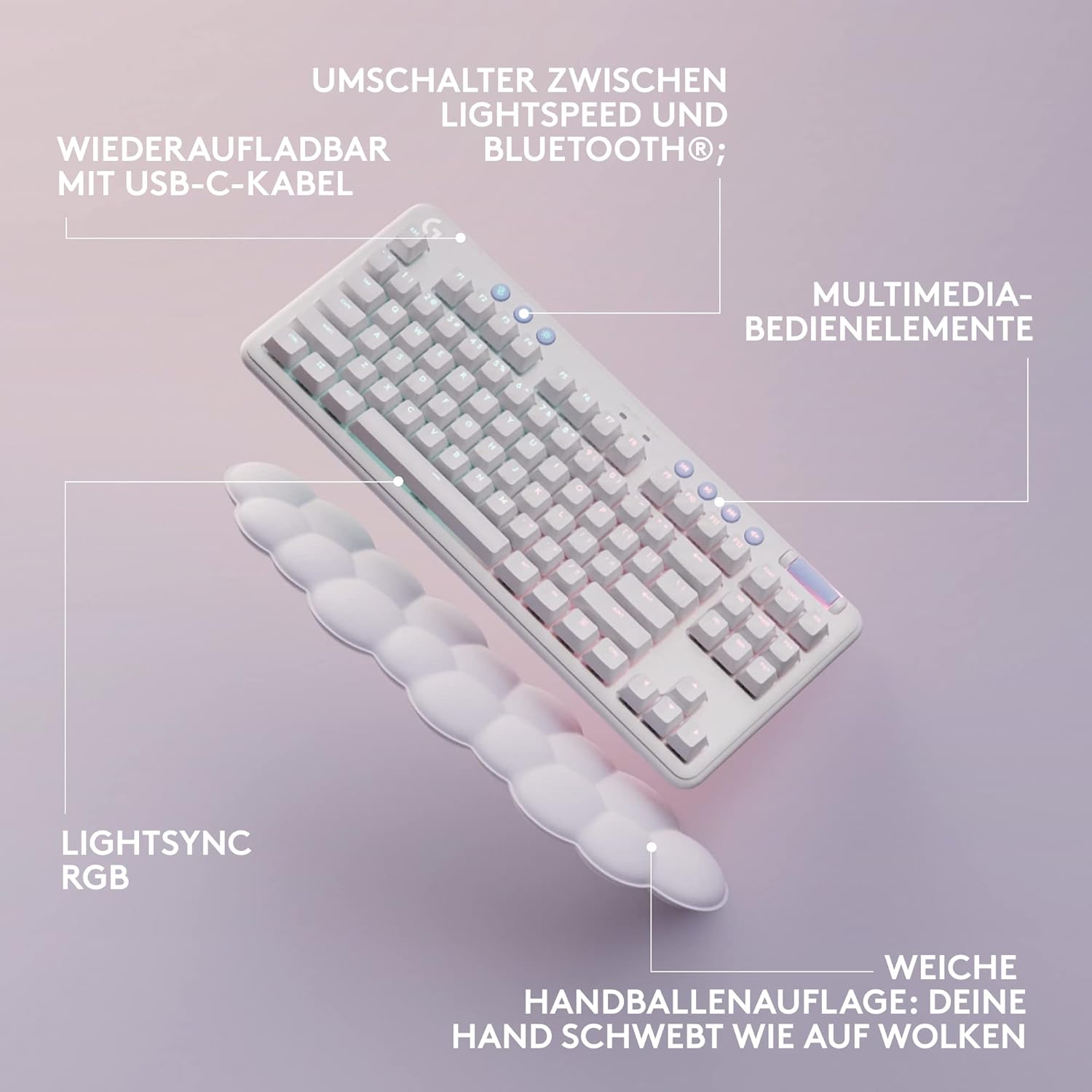 Безжична клавиатура Logitech G715 с LIGHTSYNC RGB осветление, LIGHTSPEED, тактилни превключватели (GX Brown) и поставка за длани, PC/Mac - бяла