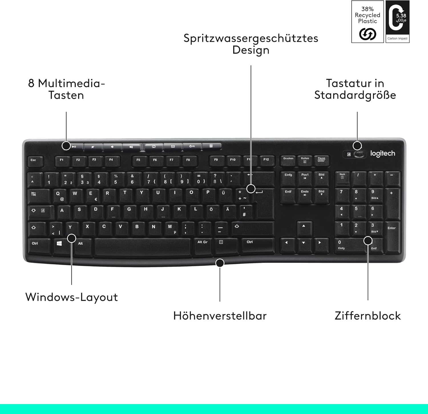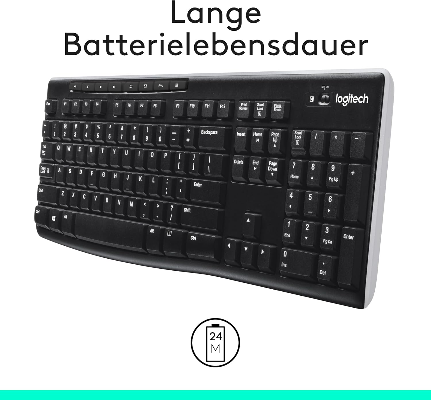 Безжична клавиатура Logitech K270 за Windows, 2.4 GHz безжична, стандартен размер, цифрова клавиатура, 8 бързи клавиша, 2 години живот на батерията, съвместима с компютър, лаптоп, немска QWERTZ подредба - черна