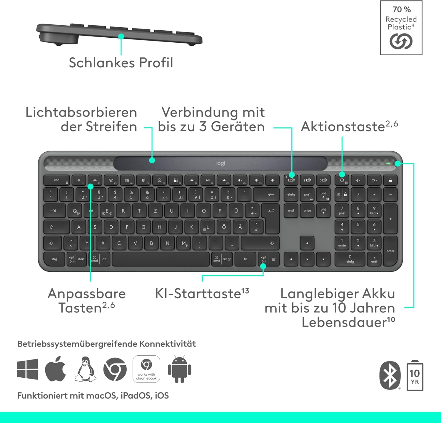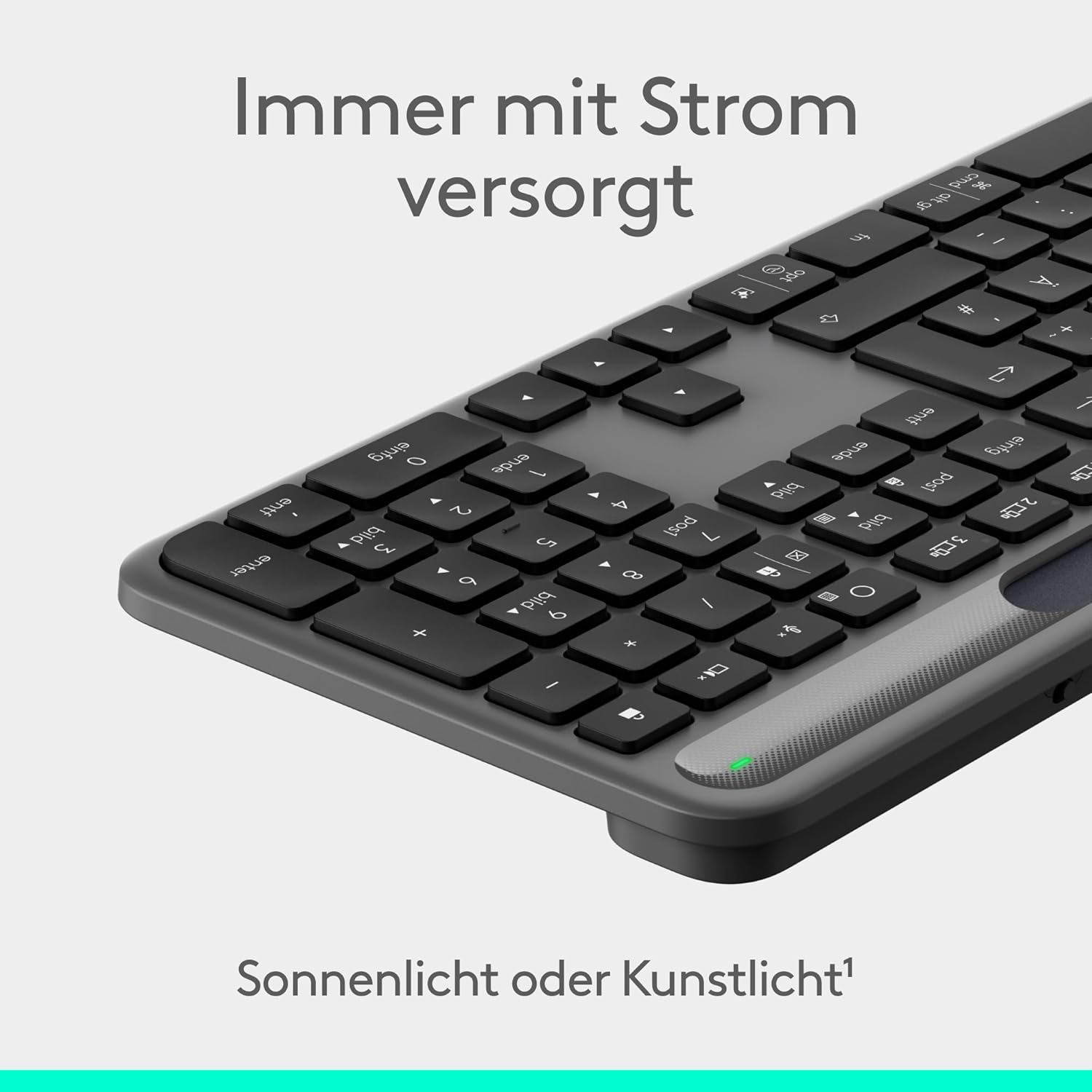 Безжична клавиатура Logitech Signature Slim Solar+, захранвана от слънчева енергия дори при изкуствена светлина, дълготрайна батерия с до 10 години живот, персонализируеми бутони, Bluetooth, DEU QWERTZ - графит