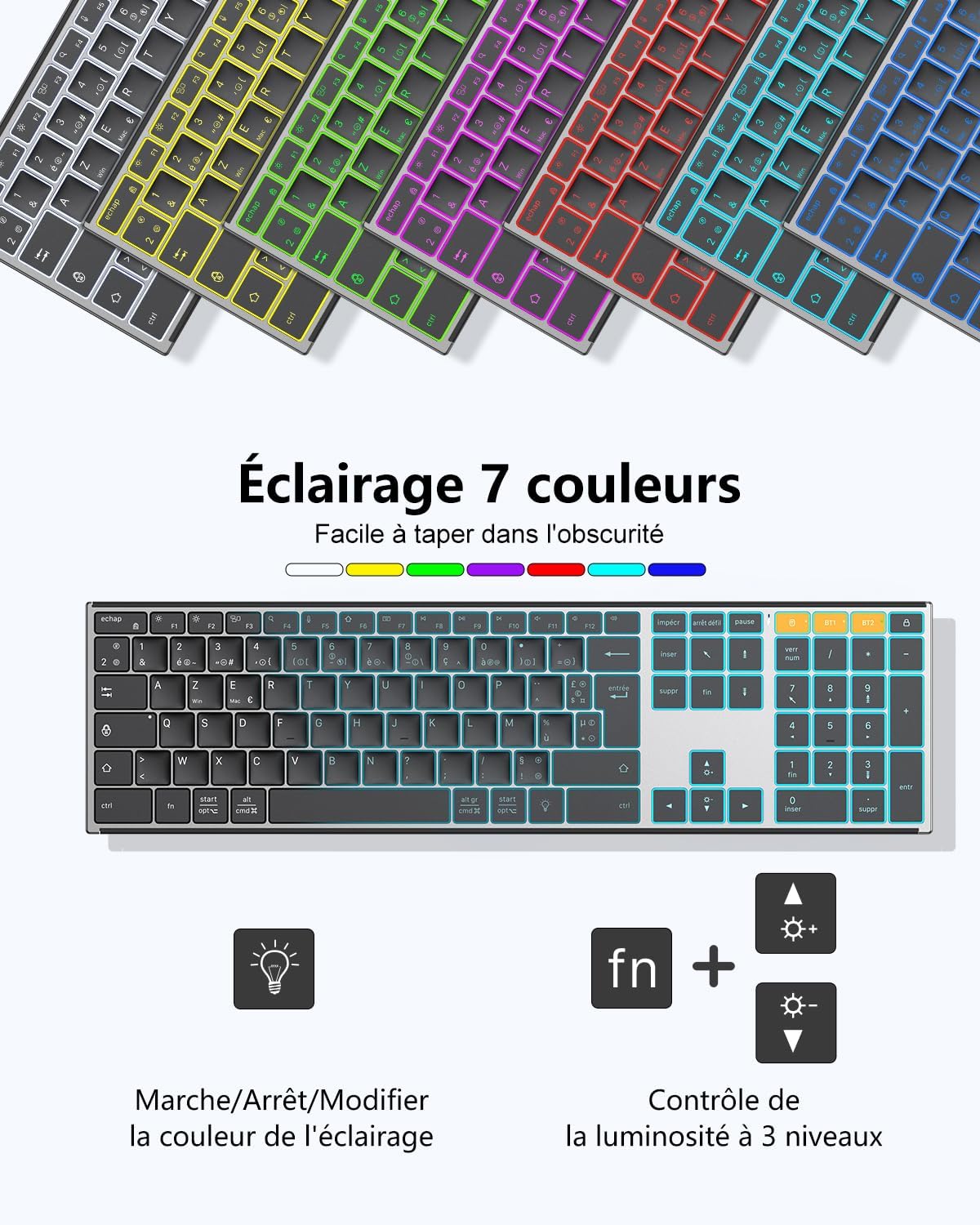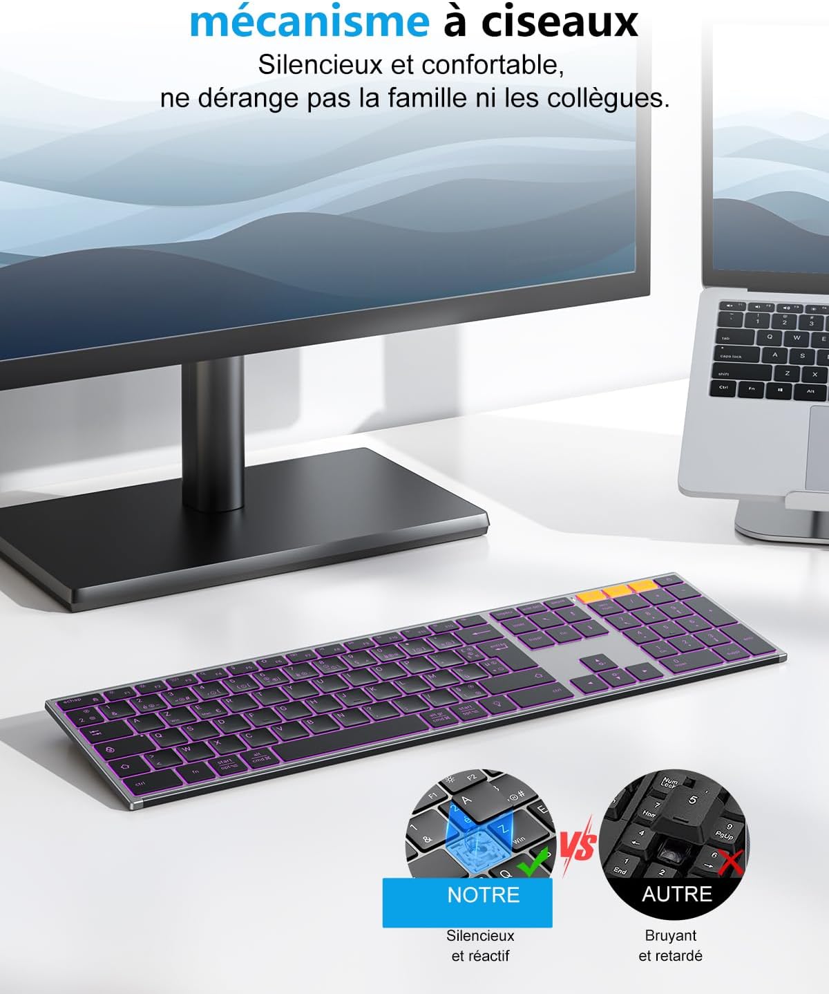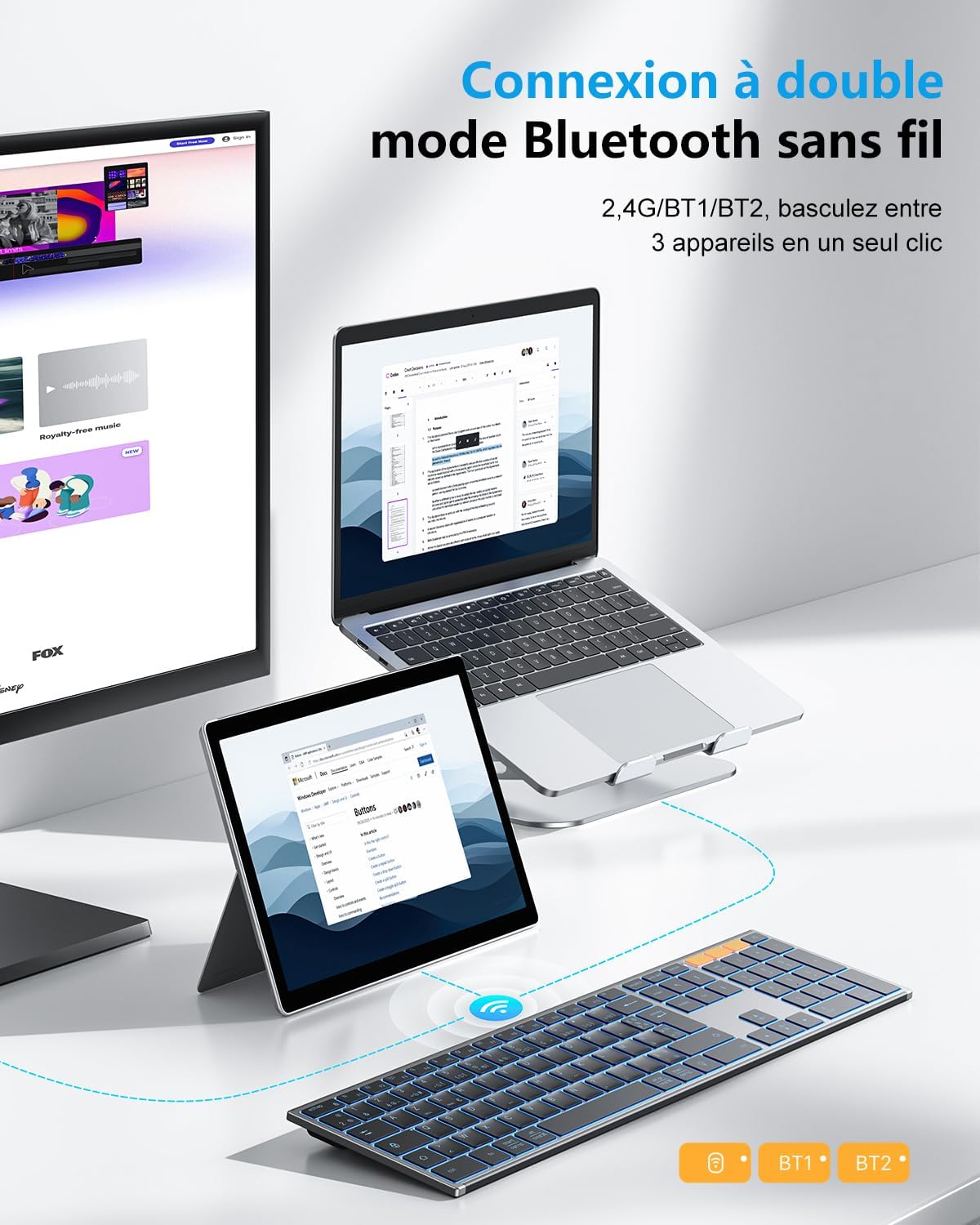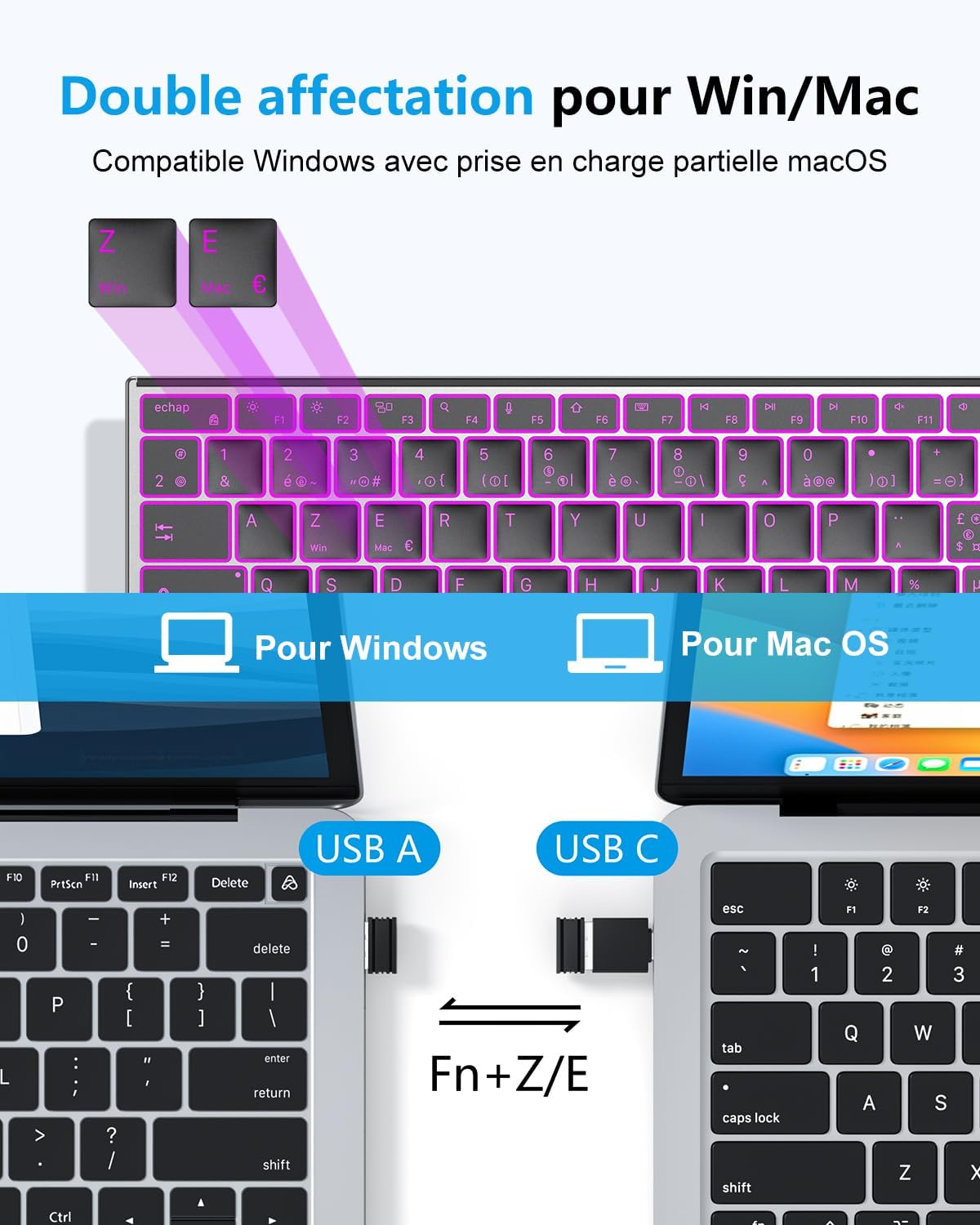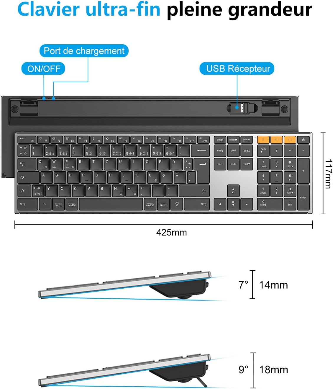 Безжична клавиатура OMOTON за Windows, Bluetooth безжична, презареждаща се с 2 канала, Bluetooth 2.4G AZERTY френска метална, ергономична, тиха клавиатура с подсветка