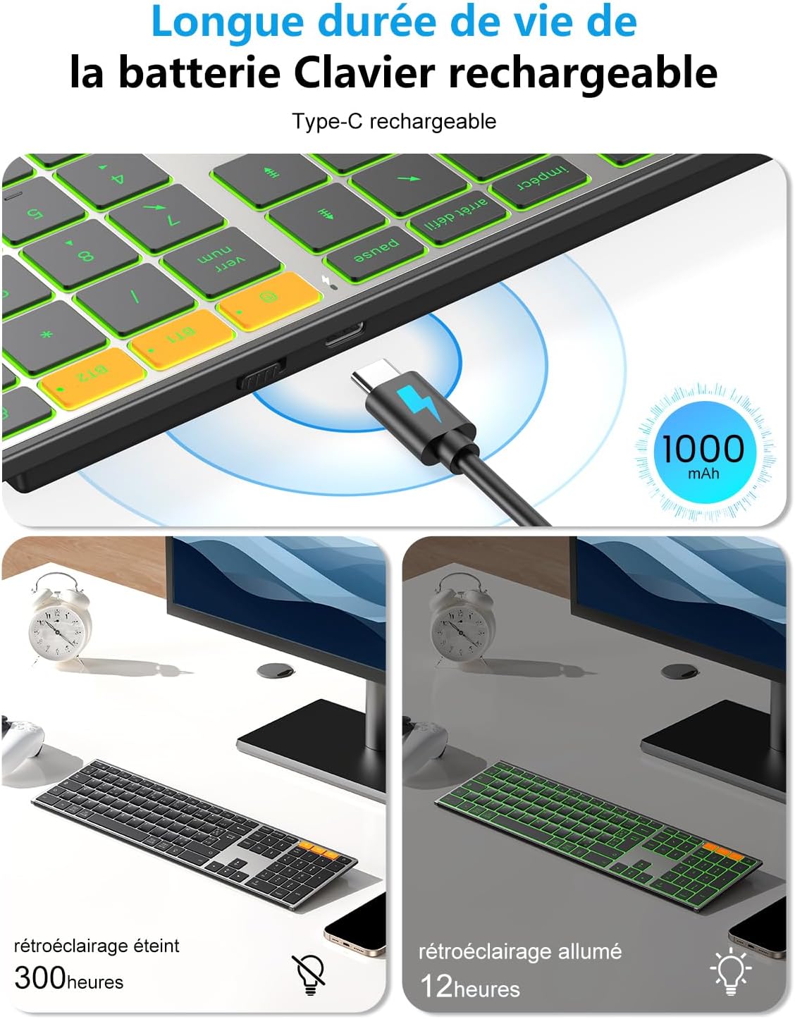 • Издръжлива презареждаща се клавиатура: Тази Bluetooth клавиатура е оборудвана с батерия от 1000 mAh, която може да се използва 300 часа без подсветка и 12 часа с подсветка. В същото време, компютърната клавиатура е презареждаща се, така че не е необходима смяна на батерии.