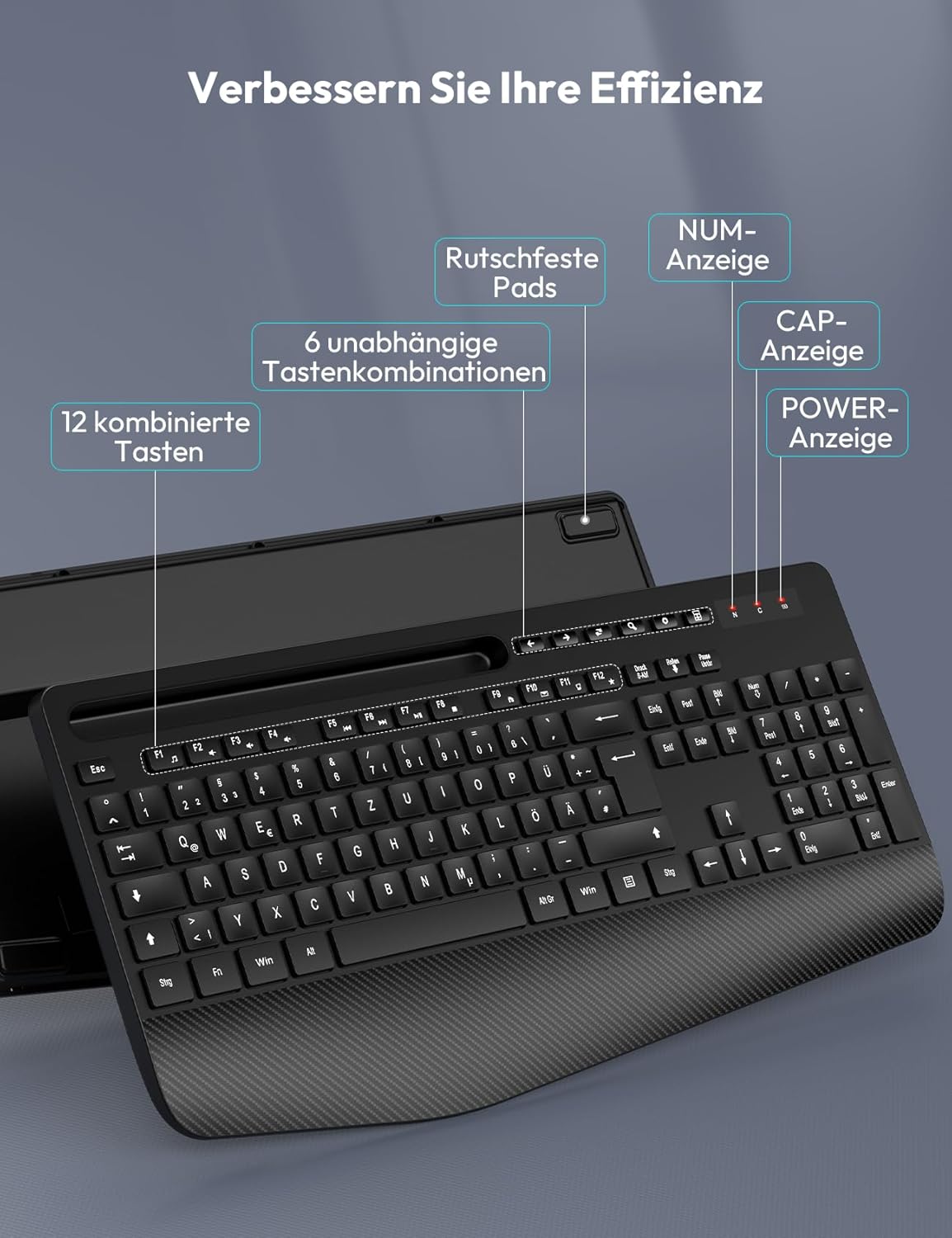 • 【СЪЗДАДЕНА ЗА КОМФОРТ】- Ергономична клавиатура с щедра опора за длани и фиксирани крачета осигурява по-добра позиция за писане, за да се намали напрежението в китката. Безжичната клавиатура е с висококачествена матова текстура и устойчиви на избледняване букви, осигурявайки ви абсолютен комфорт.