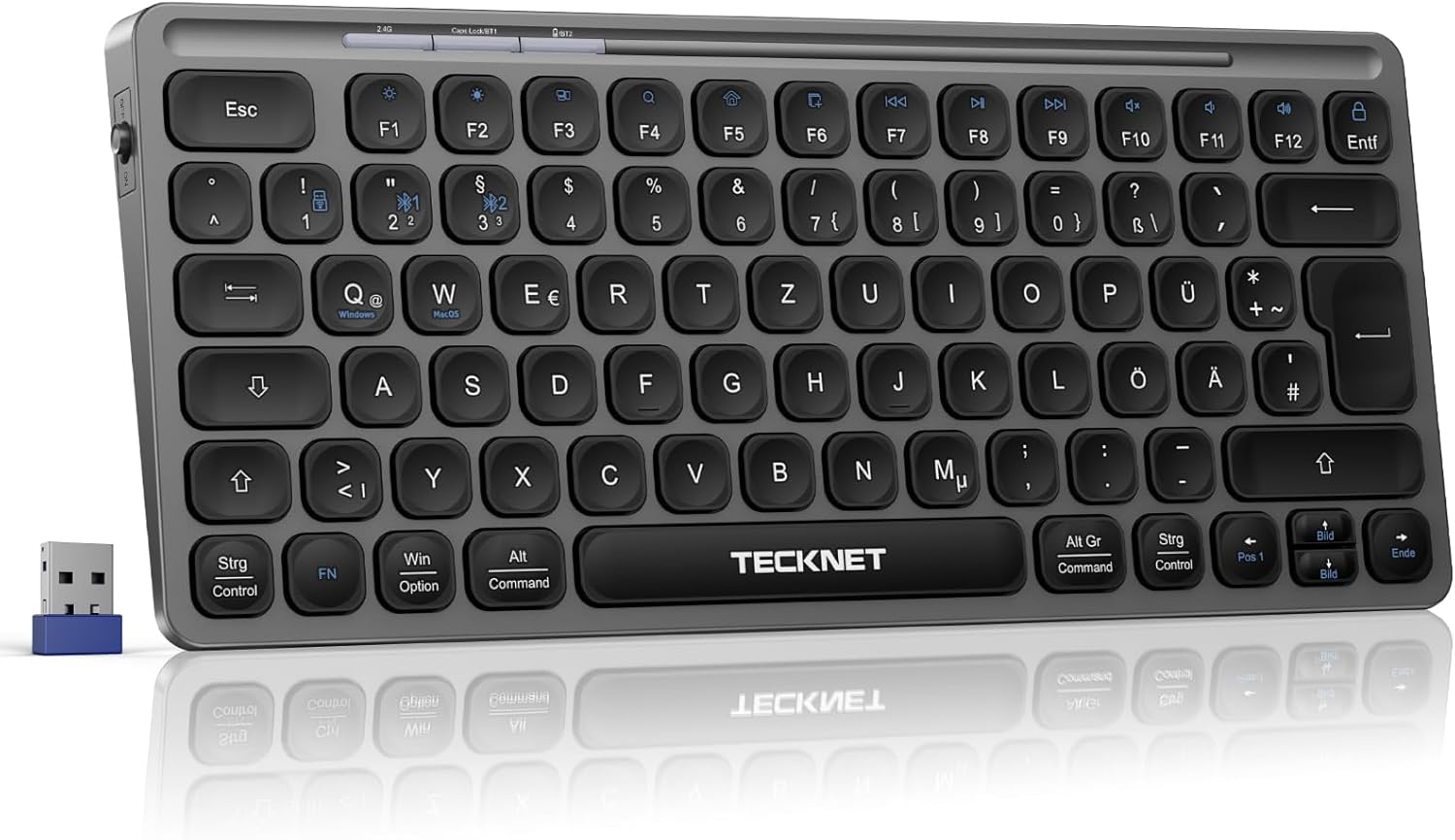 Безжична клавиатура TECKNET, Презареждащи се мини Bluetooth клавиатури, Превключване между 3 устройства (2.4G + 2BT), Малка клавиатура QWERTZ, Съвместима с MacOS, iOS, Windows, Linux, Android