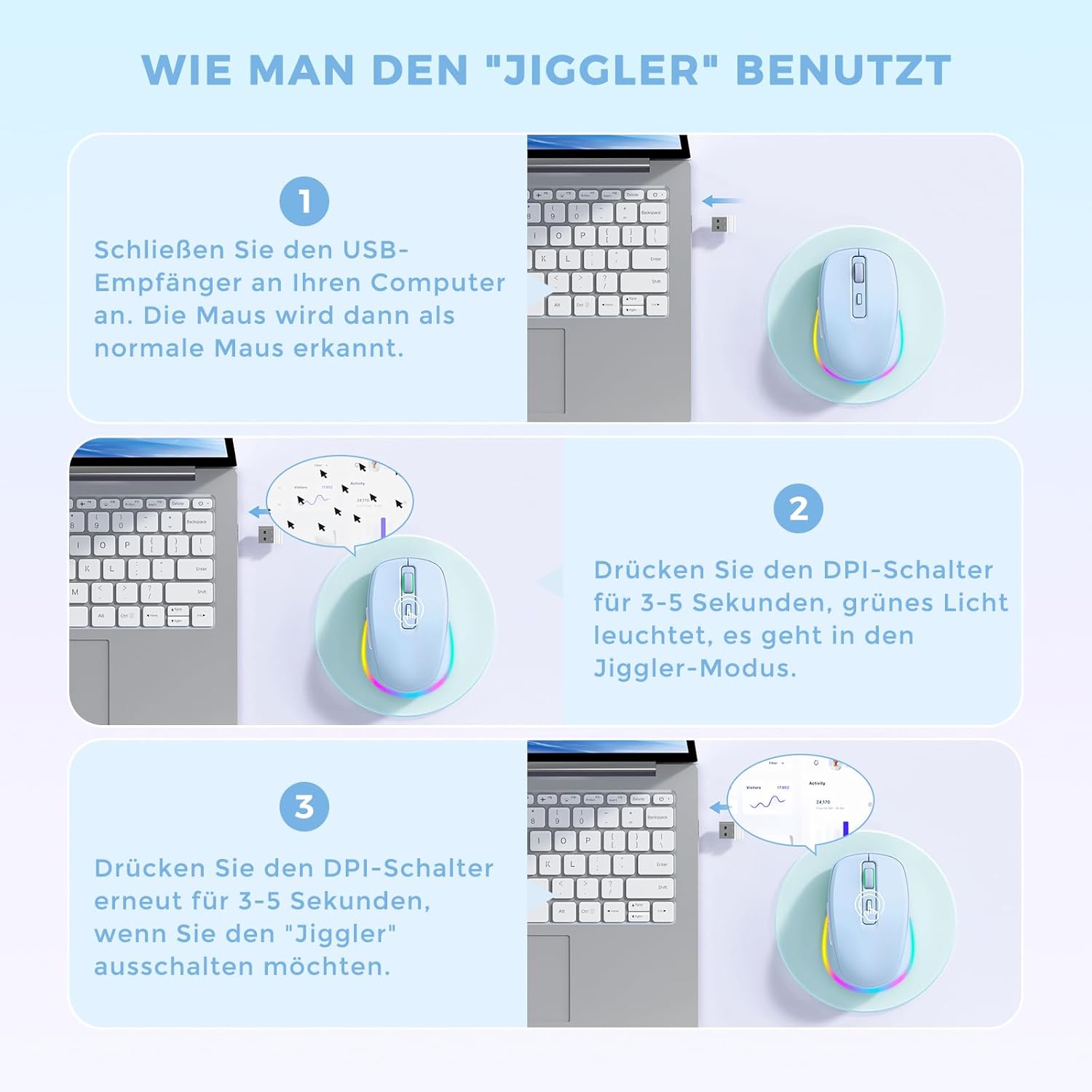 • LED мишка и мишка-джиглер 2 в 1: Ако работите от вкъщи и сте уморени да бъдете роб на компютъра си, тази мишка и джиглер в 1 може да е вашият избор. Просто натиснете и задръжте бутона DPI за 3-5 секунди, за да го настроите в режим на джиглер, за да предотвратите заключването на компютъра, ако се наложи да си тръгнете.