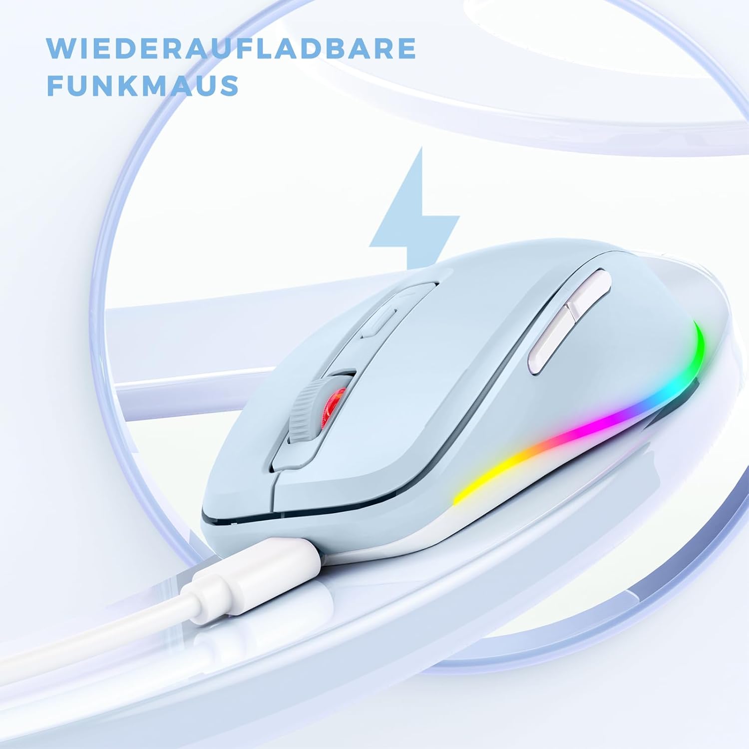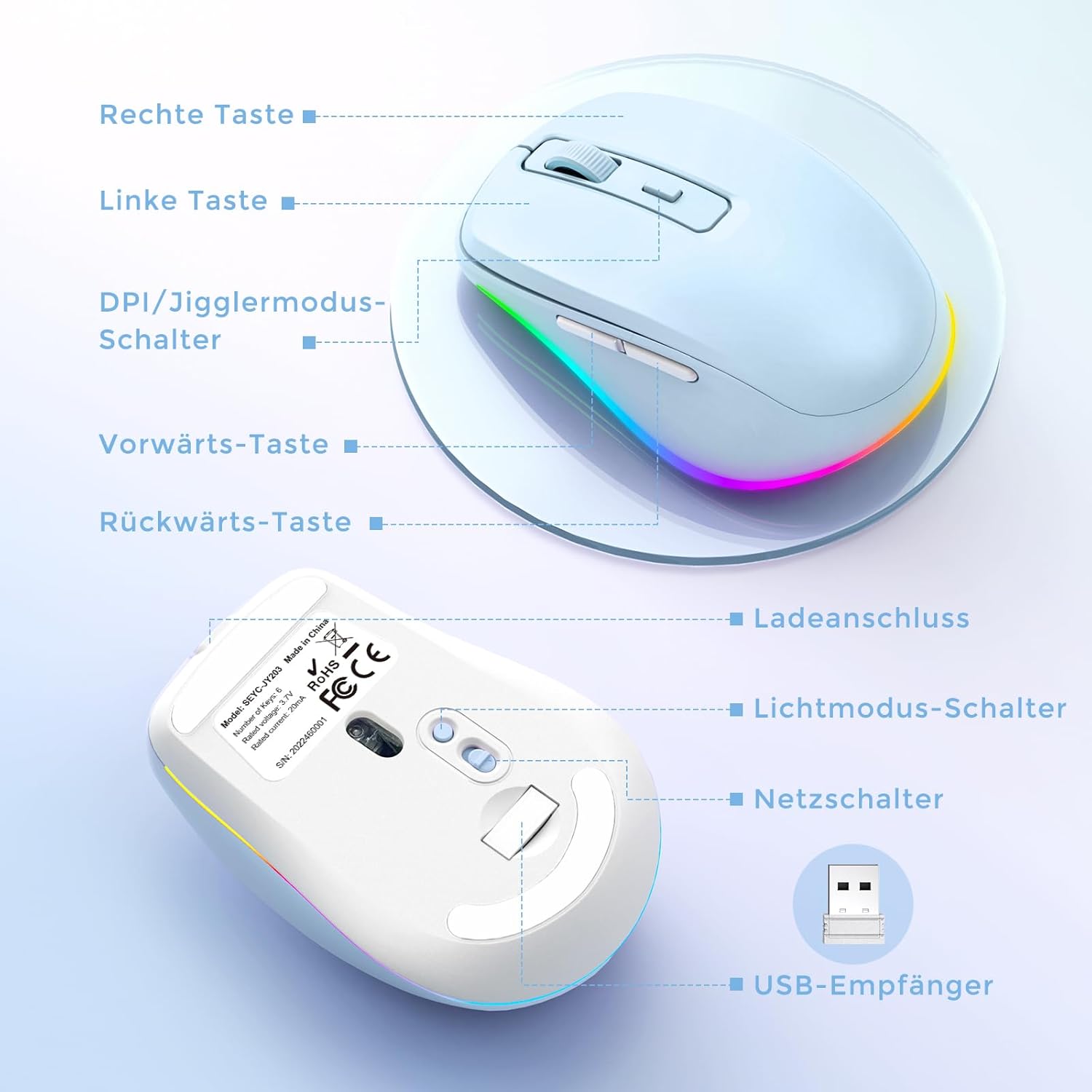 Безжична LED мишка Seenda, презареждаща се с Jiggler, тиха 2.4G USB безжична мишка за лаптоп, компютър, осветена DPI 2000 за PC, Windows, Mac OS (светло синя)