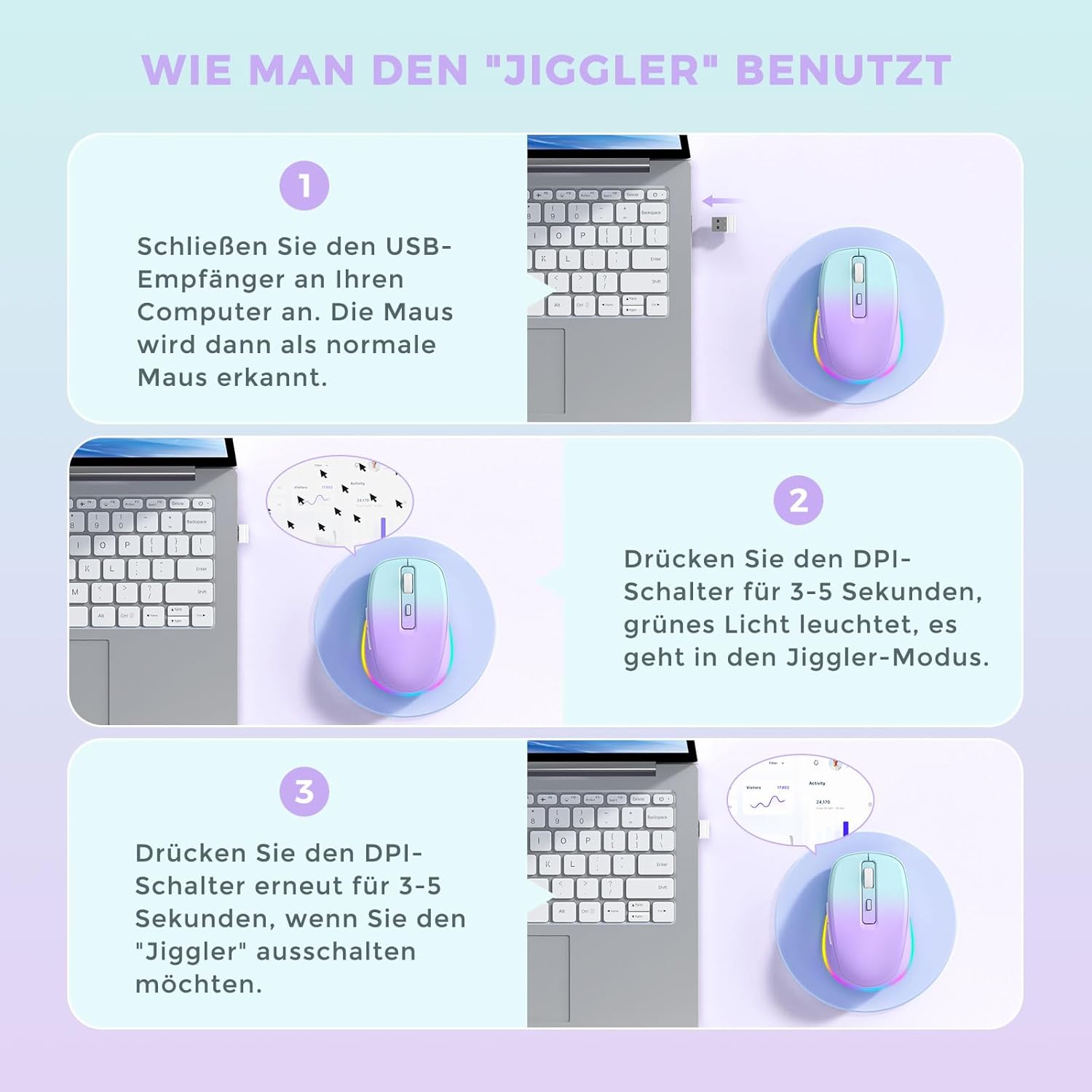 • LED мишка и мишка-джиглер 2 в 1: Ако работите от вкъщи и сте уморени да бъдете роб на компютъра си, тази мишка и джиглер в 1 може да е вашият избор. Просто натиснете и задръжте бутона DPI за 3-5 секунди, за да го настроите в режим на джиглер, за да предотвратите заключването на компютъра, ако се наложи да си тръгнете.