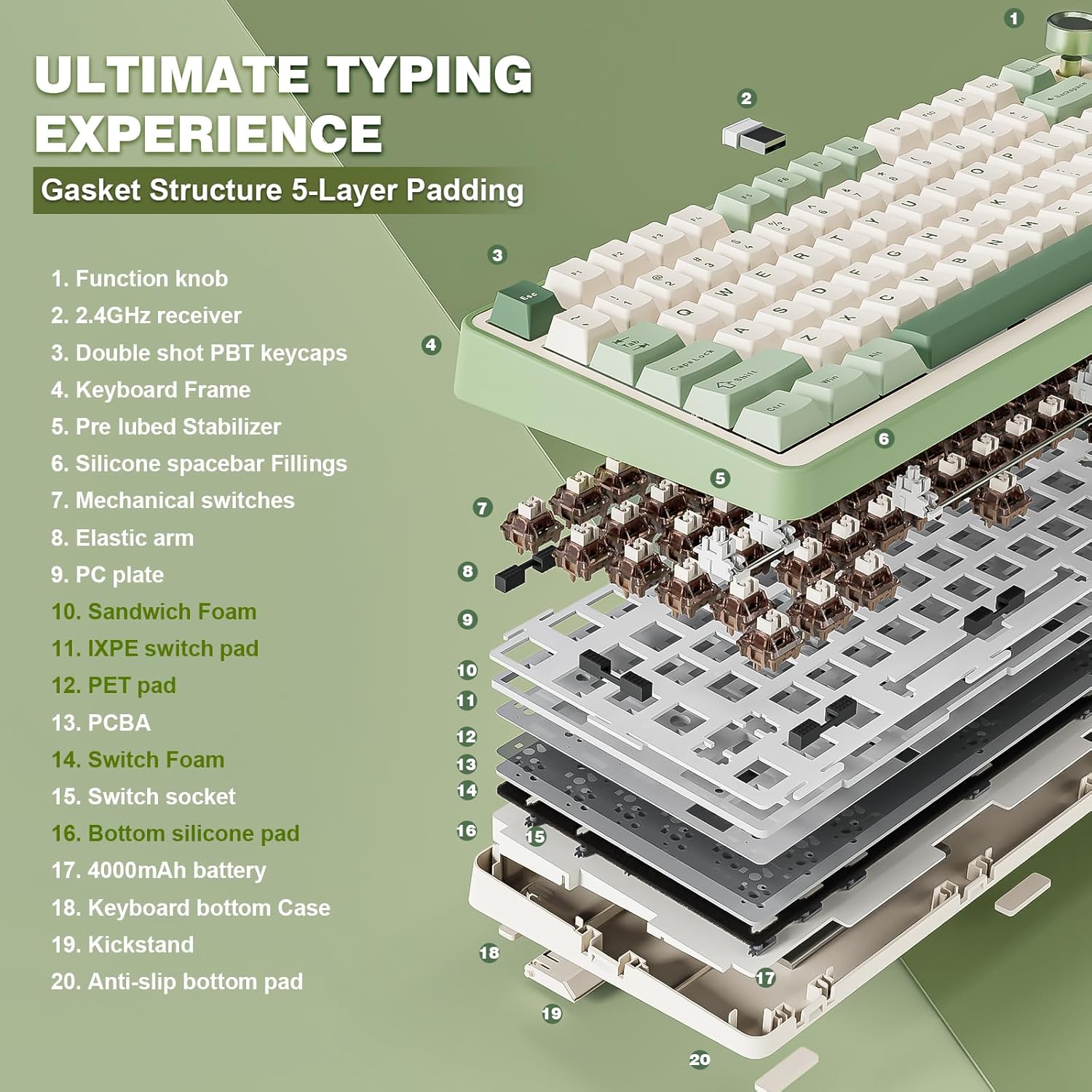 • Уплътнителна клавиатура Кремообразната клавиатура е проектирана с най-модерната уплътнителна структура. С 5-слойна подплата, дизайн за шумопотискане, клавиши с двойно покритие, прецизно настроени стабилизатори и предварително смазани механични превключватели, тази линейна клавиатура предлага почти кремообразно звучене и солидно усещане при писане.