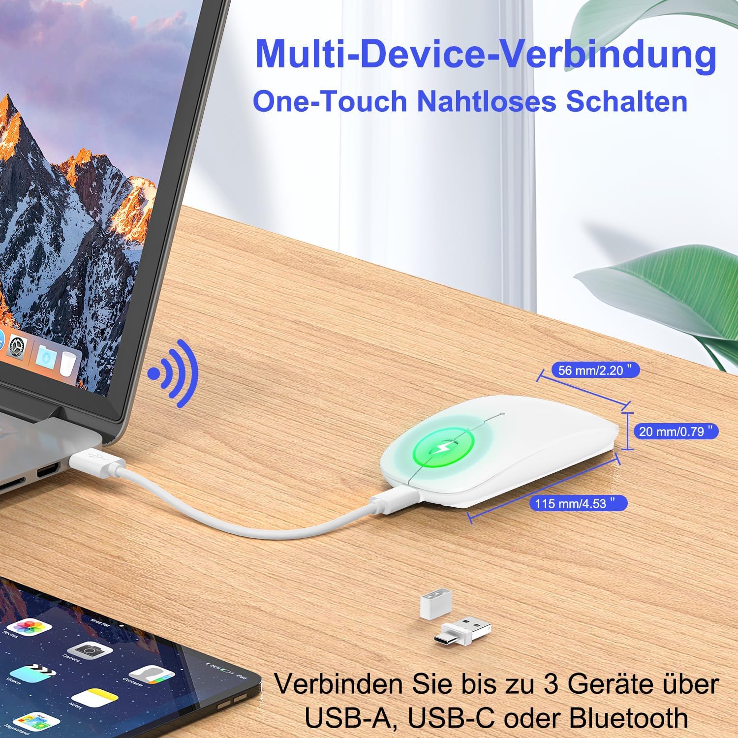 • Максимална гъвкавост за Apple и още повече връзка: свържете без усилие мишката си чрез Bluetooth 5.2 или 3.0 с Apple устройства като iPad, MacBook Pro, MacBook Air или iPhone - без адаптер! За други устройства, иновативният 2-в-1 приемник (2.4 GHz, USB-A и USB-C) предлага широка съвместимост с лаптоп, компютър, таблет и други. Една мишка - пълна гъвкавост за всички ваши устройства!