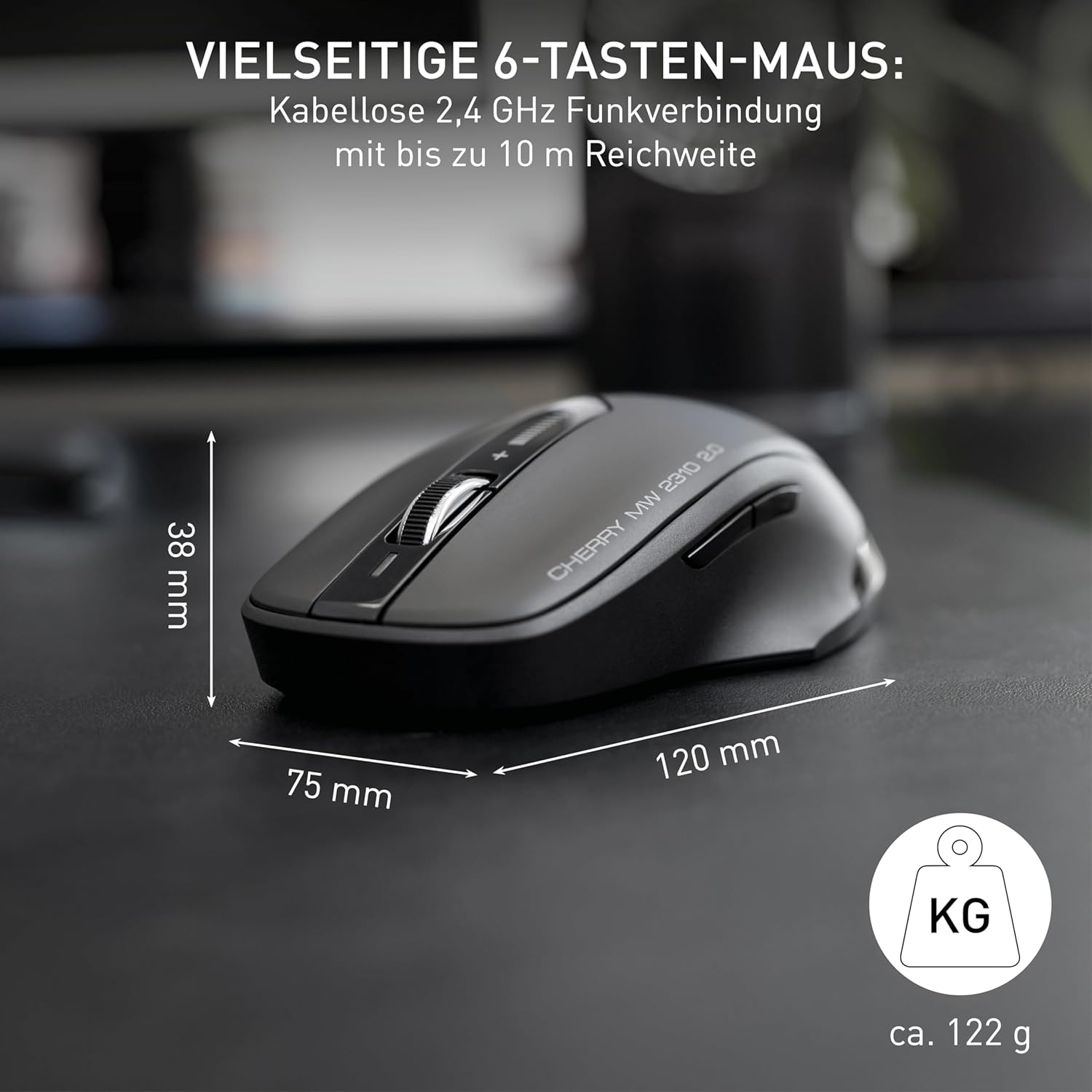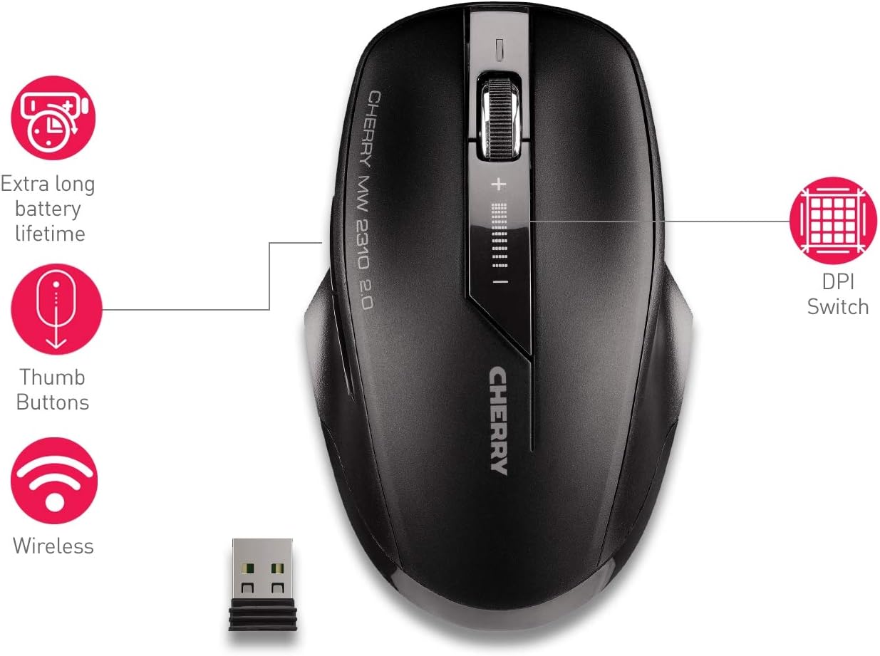 Безжична мишка CHERRY MW 2310 2.0 с 6 бутона, 2.4 GHz безжична с обхват 10 м, оптичен сензор и DPI превключвател, Nano USB приемник, за двете ръце, черна