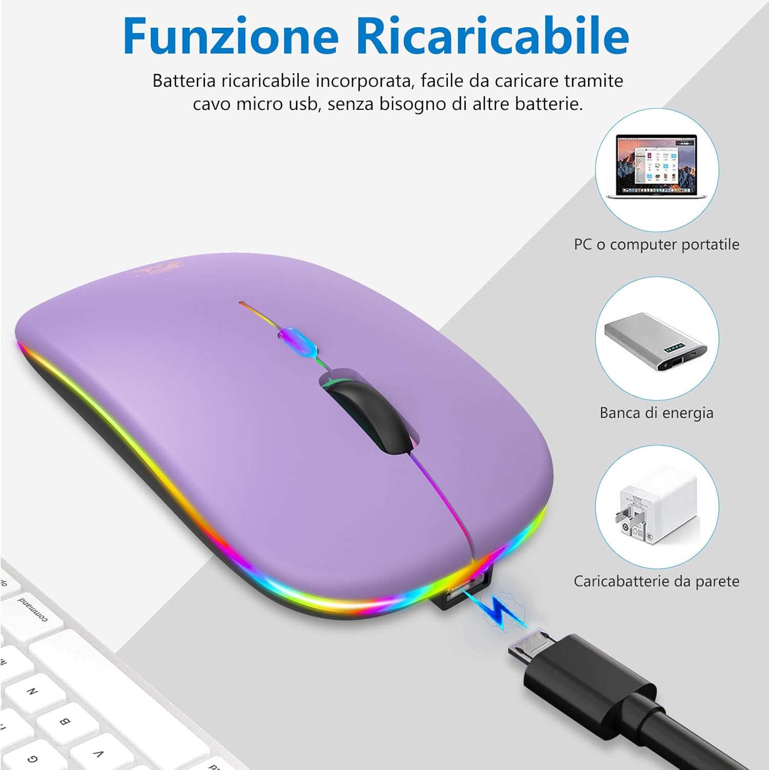 • Вградена батерия и автоматично пестене на енергия: безжичната мишка има вградена батерия (500 mAh) и се предлага с кабел за зареждане, който може да се зарежда през USB порта. Времето за зареждане е само 2-3 часа и поддържа 30 дни в режим на готовност. Ако не използвате мишката в продължение на 5 минути, тя автоматично преминава в режим на заспиване, за да пести енергия от батерията. Просто щракнете с мишката, за да се върнете в работен режим.