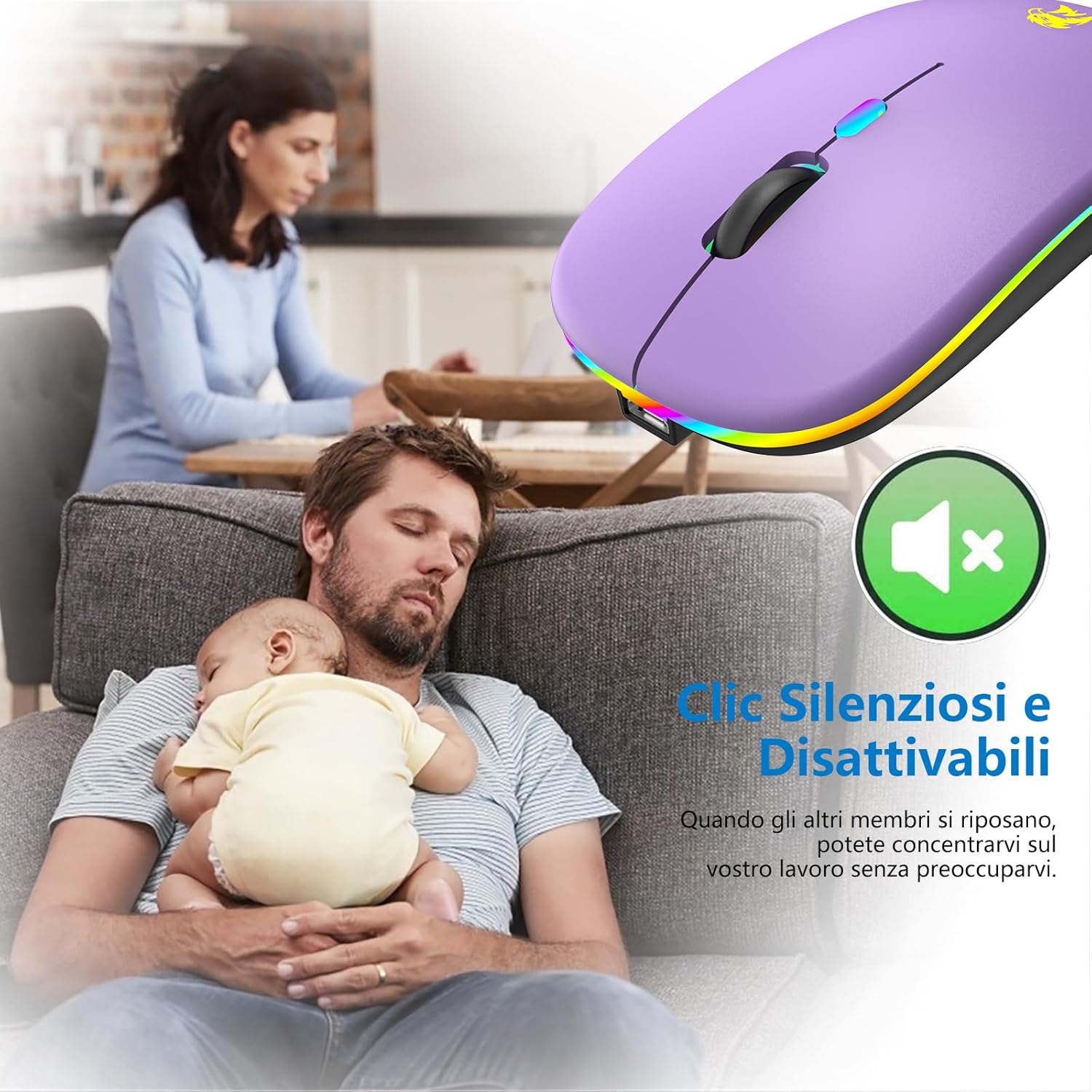 • Преносима и безшумна: Лекият и тънък дизайн на безжичната мишка позволява лесно съхранение в чанта за компютър или джоб на панталон. Специалният безшумен дизайн на левия и десния бутон ви позволява да останете фокусирани, без да се страхувате, че ще смутите другите.