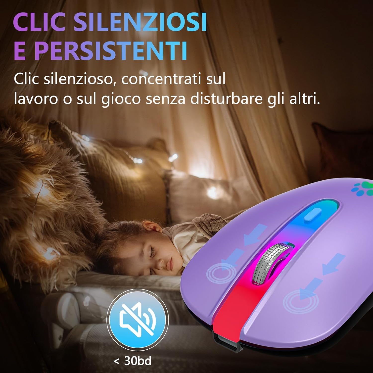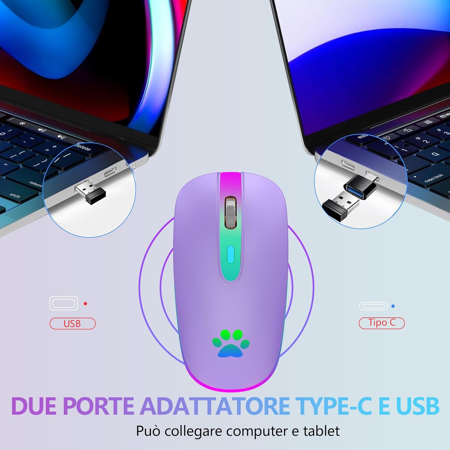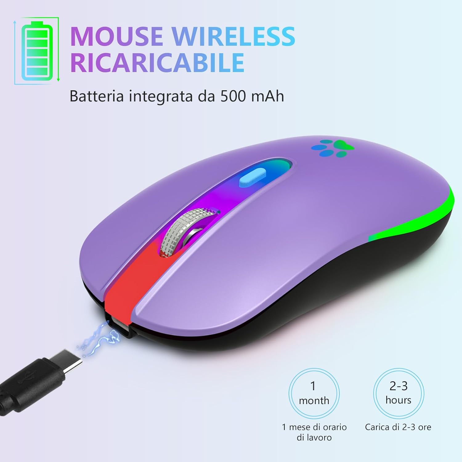 • Акумулаторна батерия със 7 цвята LED светлина: акумулаторната безжична мишка има вградена батерия от 500 mAh, която може да се презарежда чрез USB-C кабел. Времето за зареждане е само 2-3 часа и поддържа 80 часа изключително дълго време в режим на готовност. Понякога работата може да бъде скучна, но безжичната мишка за лаптоп с подсветка има 7 вида LED светлини, които ни доставят безкрайно забавление.