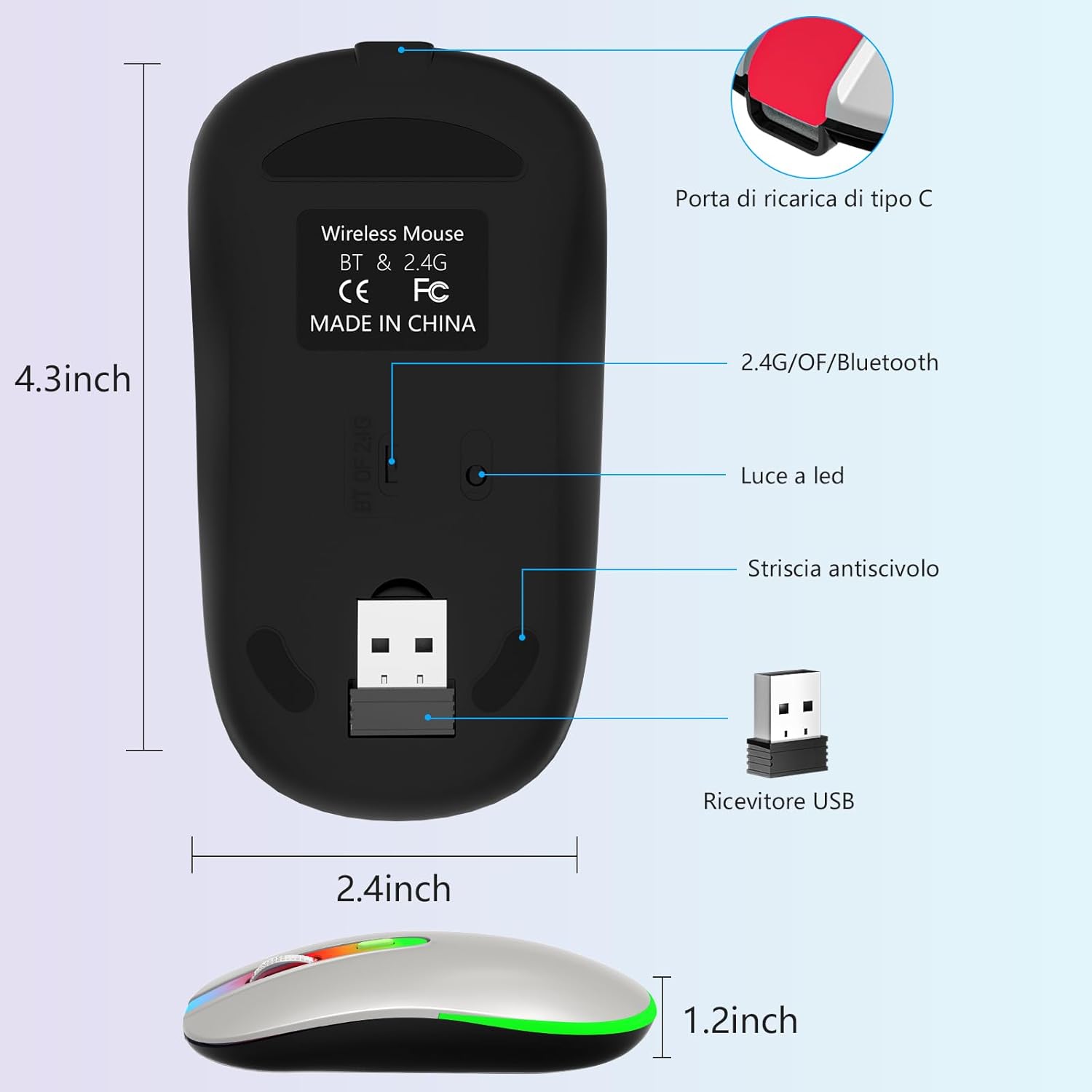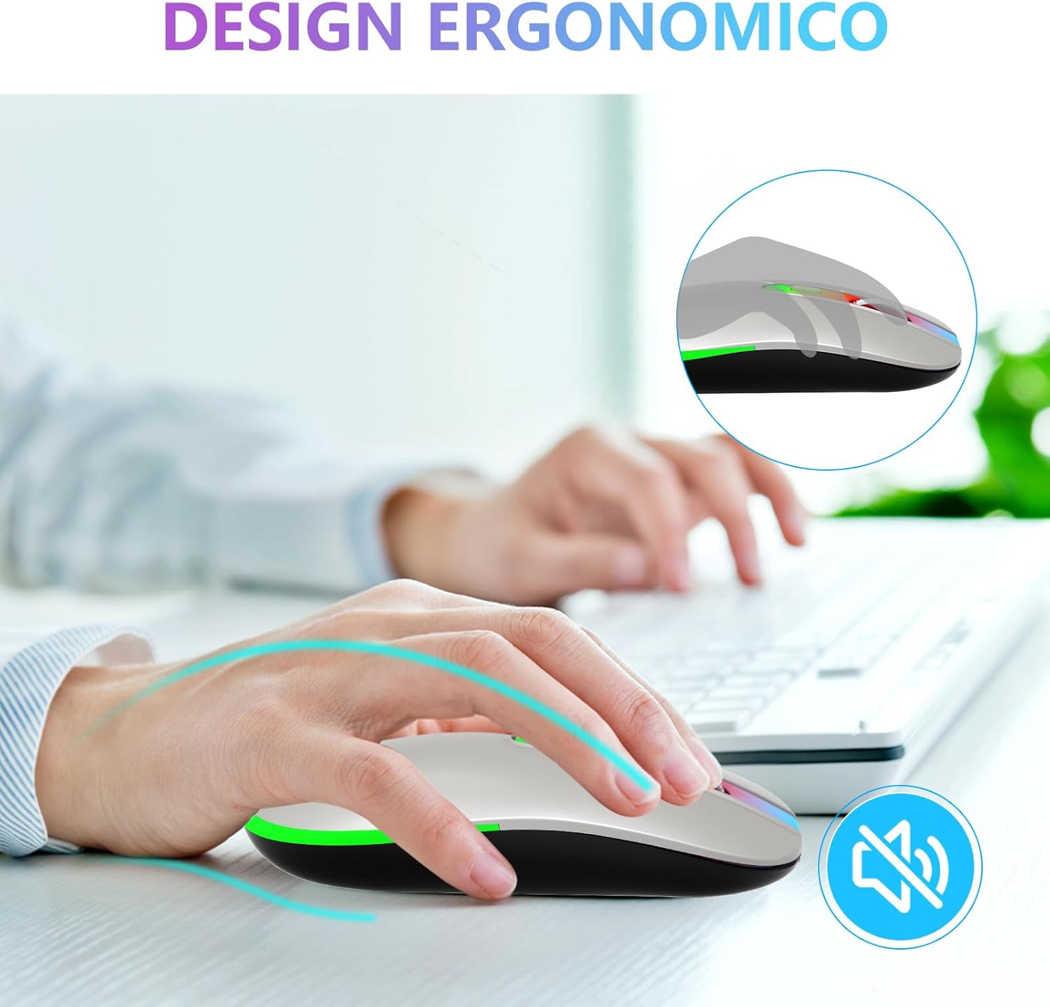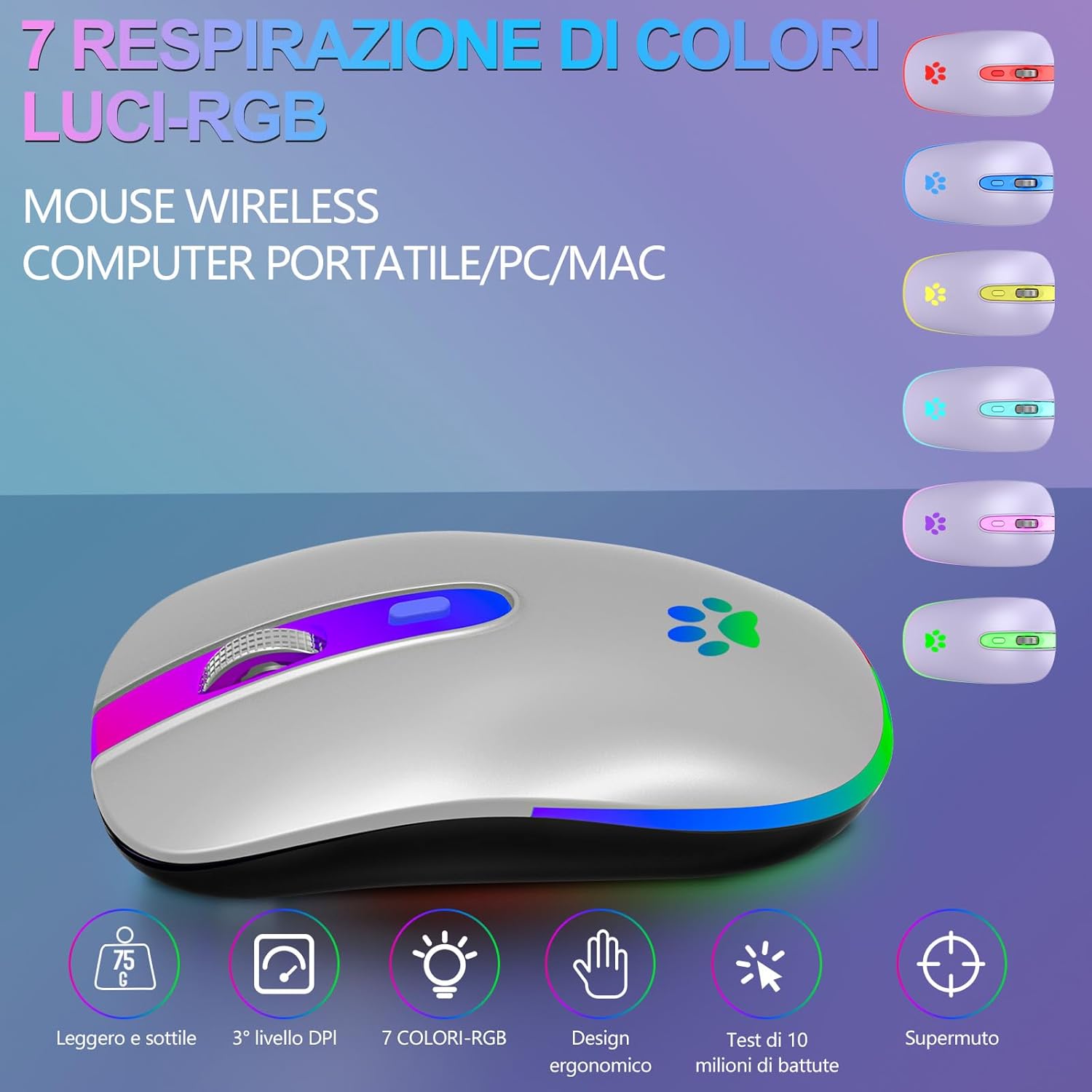 Безжична мишка KBCASE 2.4 GHz USB безжична мишка, Bluetooth мишка 1600 DPI оптично проследяване, акумулаторна геймърска безжична мишка със 7 цвята LED светлина за PC, лаптоп, Mac, iOS, Android, iPad,