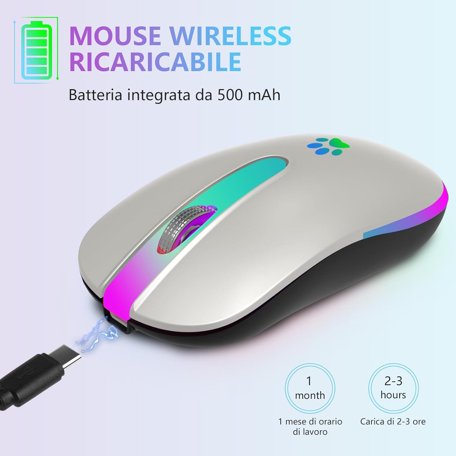 • Акумулаторна батерия със 7 цвята LED светлина: акумулаторната безжична мишка има вградена батерия от 500 mAh, която може да се презарежда чрез USB-C кабел. Времето за зареждане е само 2-3 часа и поддържа 80 часа изключително дълго време в режим на готовност. Понякога работата може да бъде скучна, но безжичната мишка за лаптоп с подсветка има 7 вида LED светлини, които ни доставят безкрайно забавление.
