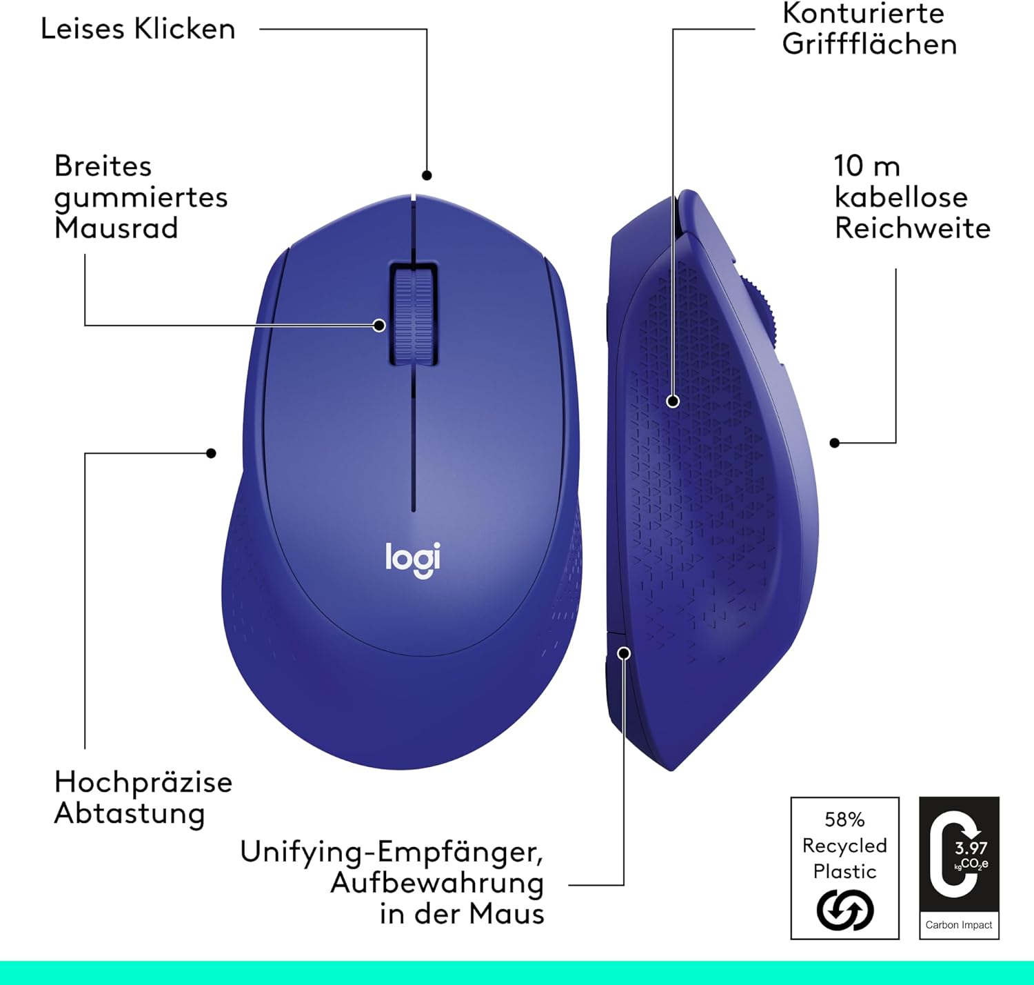 Безжична мишка Logitech M330 SILENT PLUS Насладете се на звука на тишината и същото усещане при щракване с над 90% намален шум при щракване с безжичната мишка Logitech M330 SILENT PLUS. Изработена от висококачествен материал и гумирано колело за скрол, M330 осигурява тихо плъзгане и скролиране. Удобният дизайн е с меки гумени повърхности за захващане, проектирани специално за дясната ви ръка. Безжичната компютърна мишка, работеща с батерии, е семпла, надеждна и здрава, с дълъг живот на батерията от 24 месеца (2). Мишката е оборудвана с nano USB приемник и Logitech Advanced Optical Tracking. Започнете веднага, тъй като не е необходима инсталация на софтуер или драйвери. Детайли за продукта: Размери: 105,4 x 67,9 x 38,4 мм Тегло (с батерии): 91 г Безжичен обхват: До 10 м Сензор: Advanced Optical Tracking DPI (мин./макс.): 1000± Скролиране: Ред по ред Колело за скролиране: Гумено, 2D, механично Брой бутони: 3 (ляв/десен клик, среден клик) Сертифициран за работа с Chrome Book(4) Съвместим с Windows 7, 8, 10 или по-нова версия, macOS 10.5 или по-нова версия, Chrome OS, Linux Kernel 2.6+ (1) Сравнение на нивата на шум между Logitech M330 и Logitech M170. Ниво на шум при ляв клик в dBA, измерено от независима лаборатория, на разстояние 1 м. (2) Животът на батерията зависи от употребата и условията на компютъра. (3) Безжичният обхват зависи от употребата, околната среда и условията на компютъра. (4) Този продукт е сертифициран по стандартите за съвместимост на Google. Google не носи отговорност за работата на този продукт или за неговото съответствие със стандартите за сигурност. Chromebook и сертификатът „Работи с Chromebook“ са търговски марки на Google LLC. (5) Според независими данни за продажбите на ключови пазари в бройки (юли 2019 г. – юли 2020 г.), само за продажба на дребно: Калифорния, Китай, Франция, Германия, Индонезия, Корея, Русия, Швеция, Тайван, Турция, Великобритания, САЩ