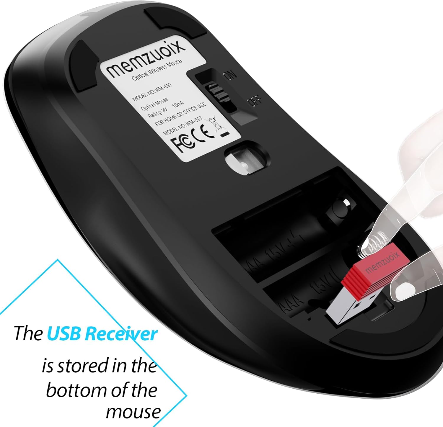 • Енергоспестяваща: безжичната мишка memzuoix се захранва от две AAA батерии (не са включени) и автоматично превключва в режим на пестене на енергия след 7 минути неактивност. С едно щракване върху произволен бутон тя е веднага готова за употреба отново.