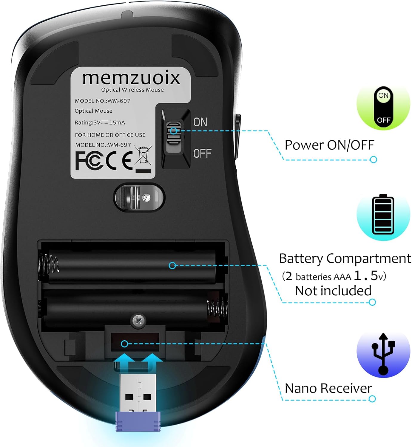 • Енергоспестяваща: безжичната мишка memzuoix се захранва от две AAA батерии (не са включени) и автоматично превключва в режим на пестене на енергия след 7 минути неактивност. С едно щракване върху произволен бутон тя е веднага готова за употреба отново.