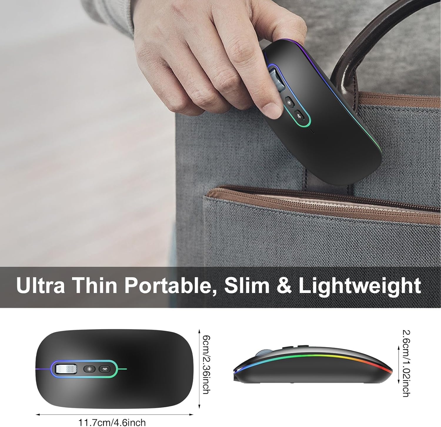 • Преносима безшумна мишка: Безжичната мишка RaceGT намалява шума с 85%, може да ви накара да работите или учите, подходяща е и за кафене, библиотека или друго обществено място, няма да безпокои другите хора по време на употреба. Лекотата от 90 г и преносимият дизайн от 11 x 7,1 x 4,2 см я правят лесна за носене в чантата ви или за пътуване.