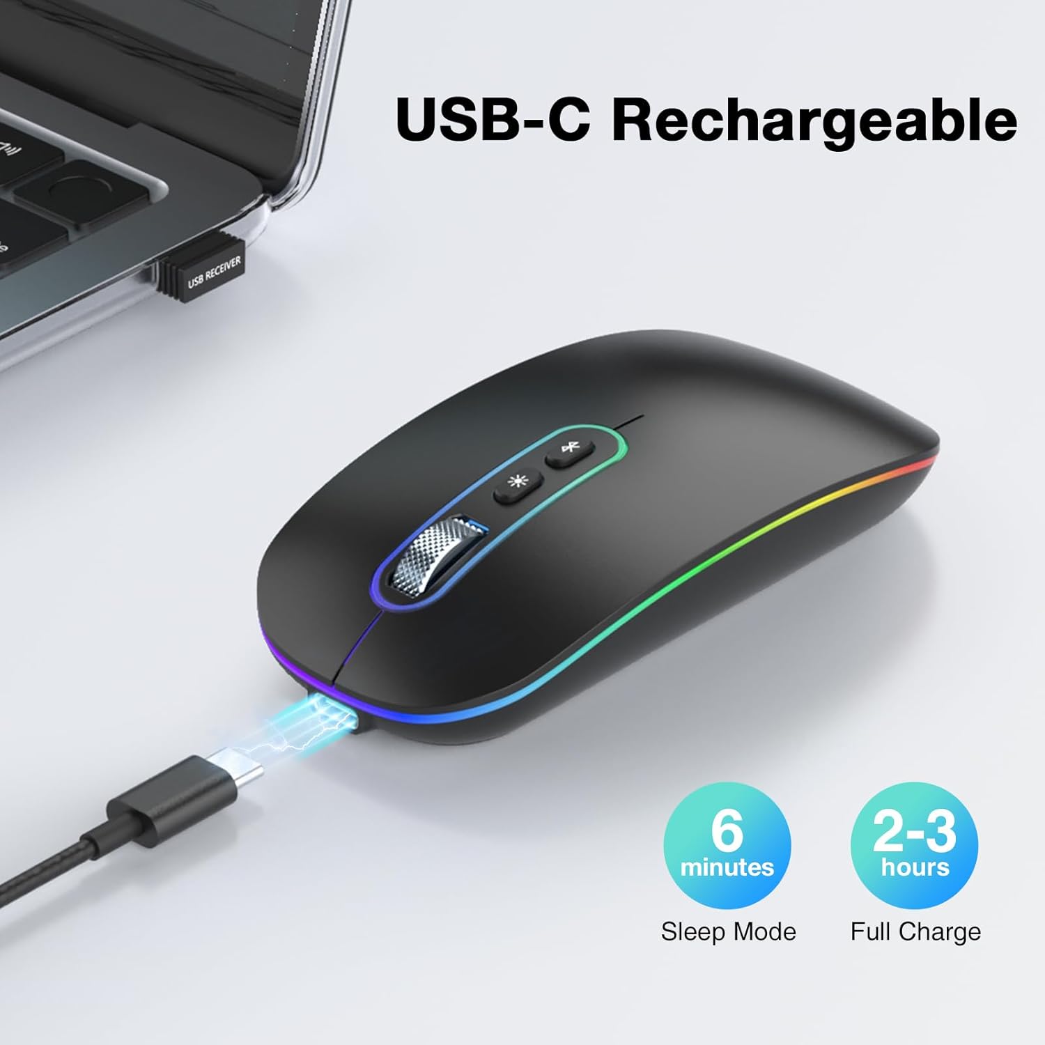 • Безжична презареждаща се мишка: Омръзна ли ви постоянно да сменяте батериите? Безжичната мишка RaceGT има вградена батерия и може да се зарежда чрез Type-C интерфейса. Просто свържете кабела, не е необходимо да сменяте батерията (кабелът за зареждане е включен в комплекта). Компютърната мишка автоматично преминава в режим на заспиване след 5 минути неактивност, можете да преместите мишката или да кликнете върху произволен бутон, за да я събудите безжично.