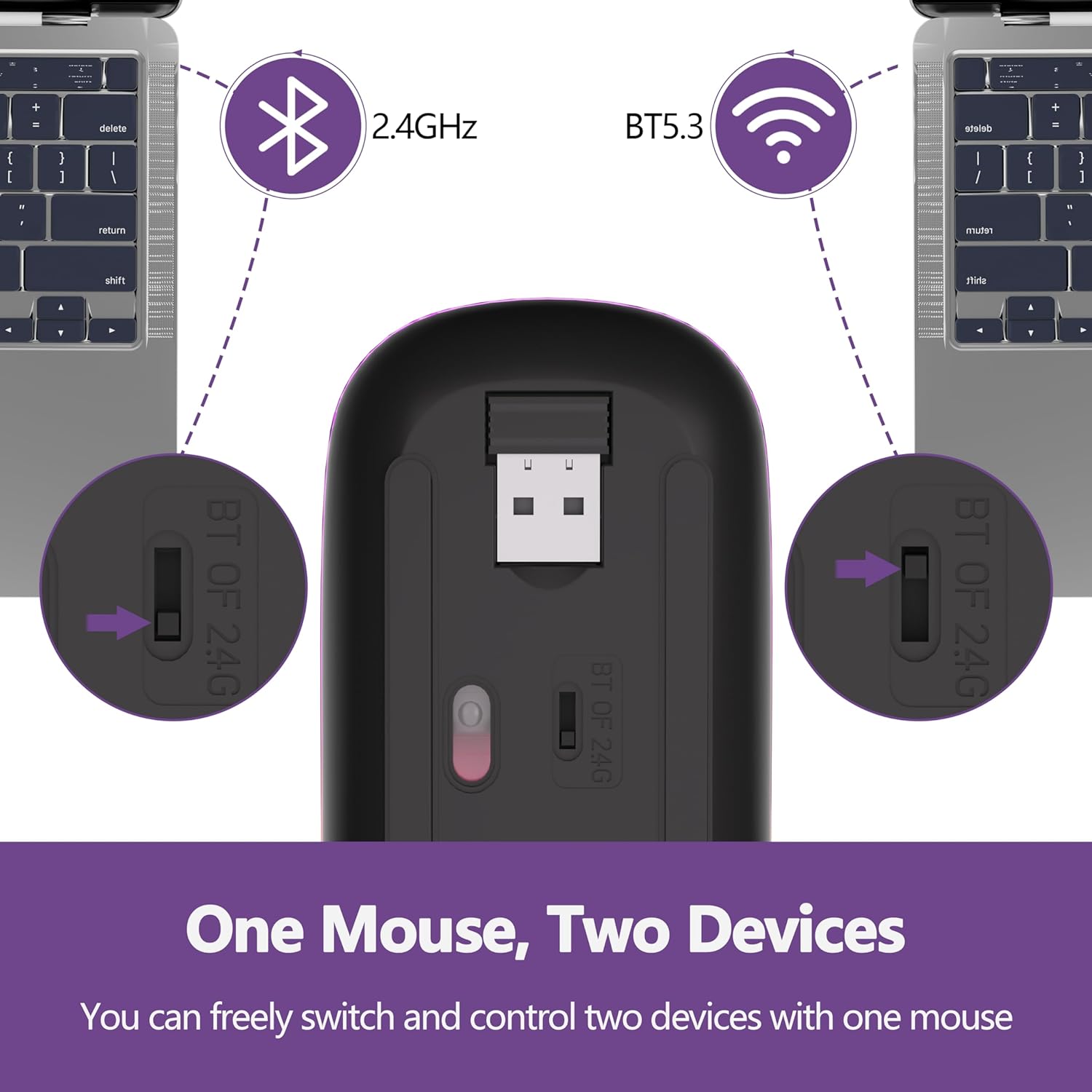 • Широка съвместимост: USB мишката в режим 2.4 GHz е подходяща за лаптопи, настолни компютри или други устройства с USB портове. Просто включете USB приемника и сте готови. Bluetooth мишката работи с всеки лаптоп, Mac, PC, iPad и др. или iPhone с iOS 13 или по-нова версия с Bluetooth. Съвместима с почти 99% от устройствата.