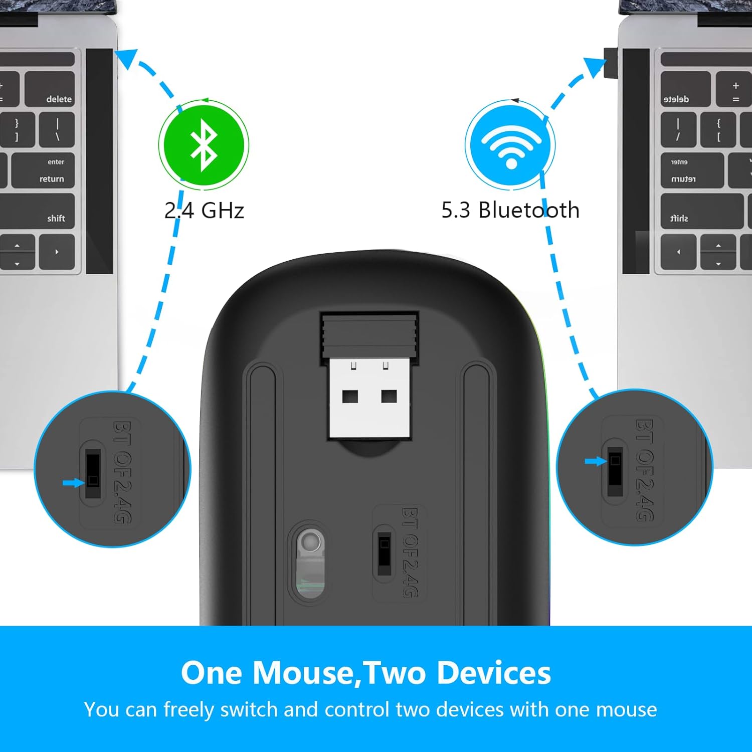 • Широка съвместимост: USB мишката в режим 2.4 GHz е подходяща за лаптопи, настолни компютри или други устройства с USB портове. Просто включете USB приемника и сте готови. Bluetooth мишката работи с всеки лаптоп, Mac, PC, iPad и др. или iPhone с iOS 13 или по-нова версия с Bluetooth. Съвместима с почти 99% от устройствата.