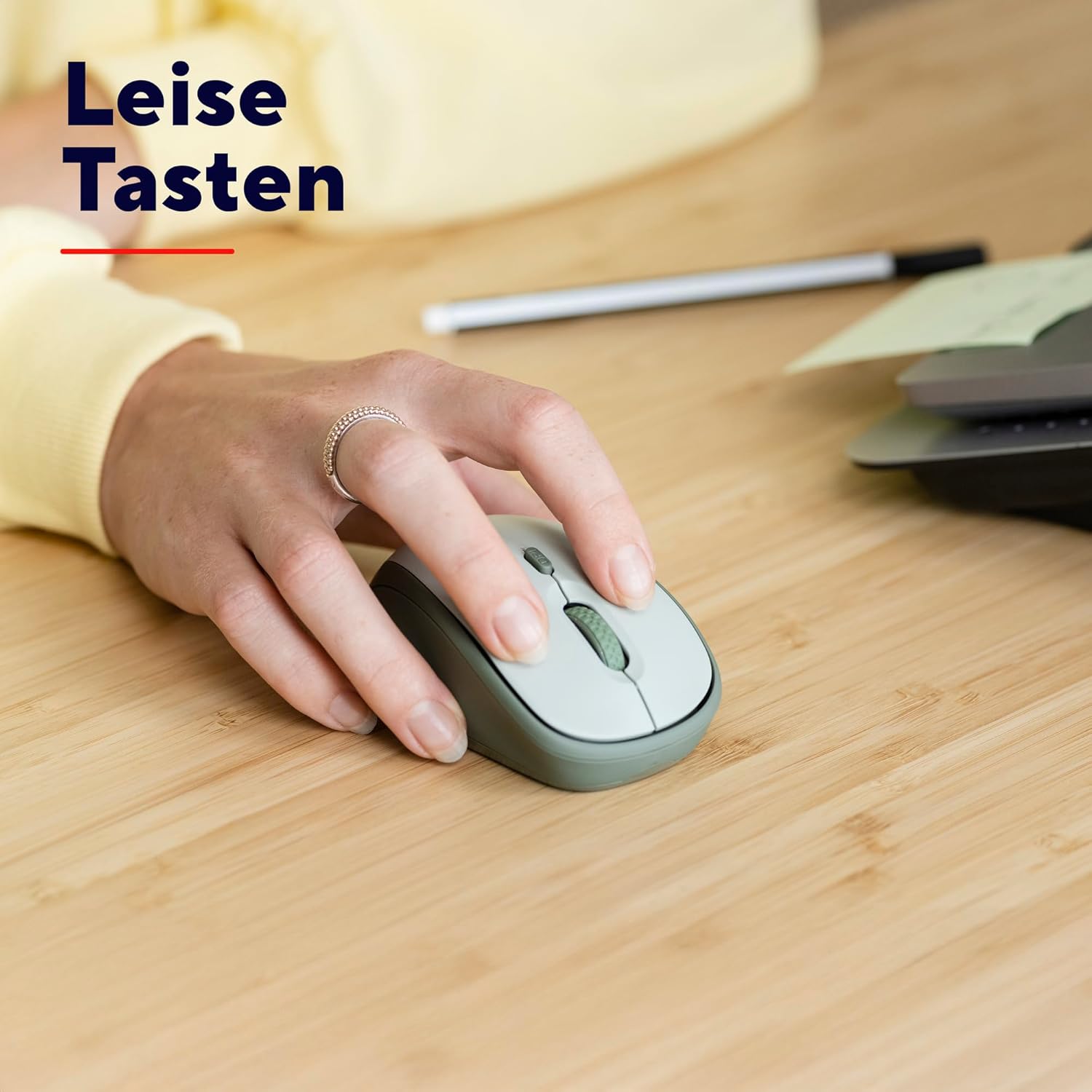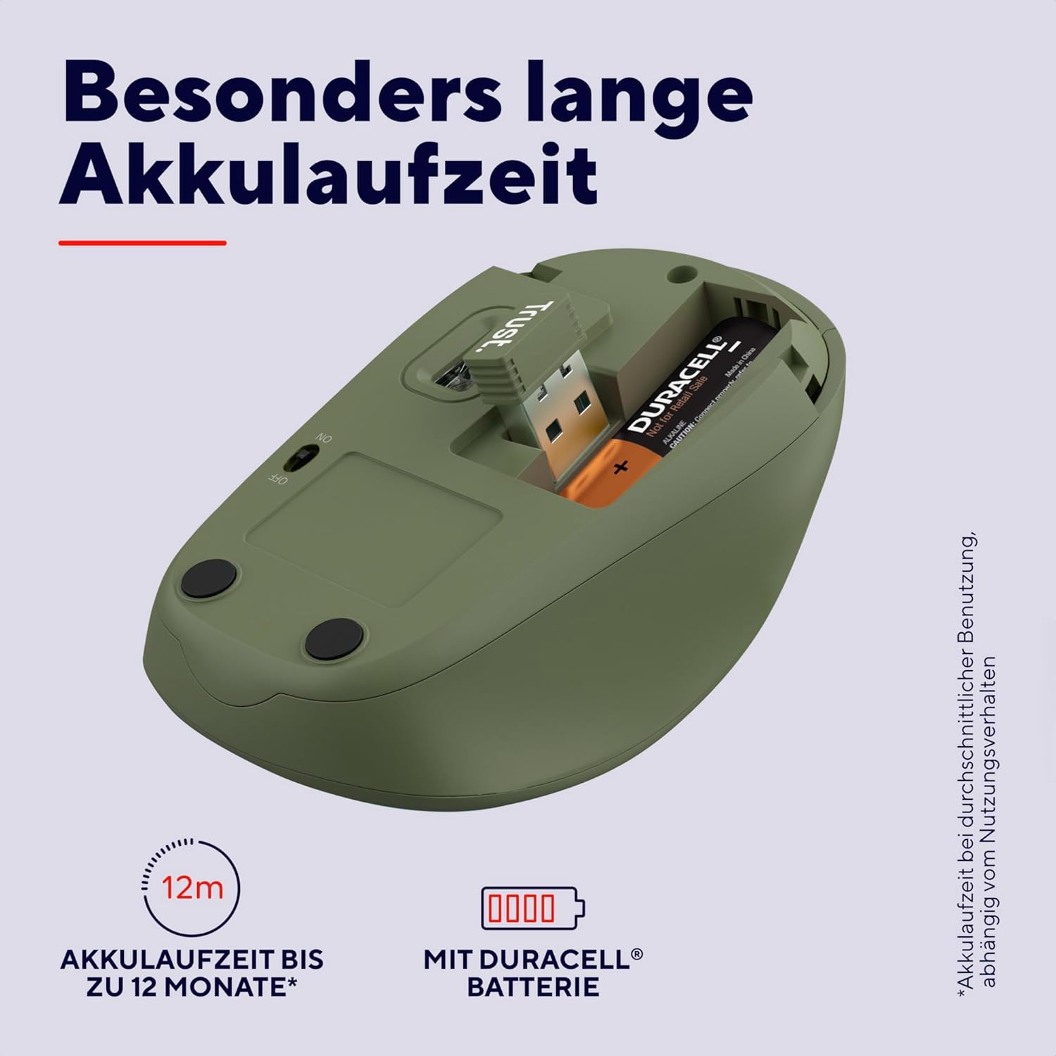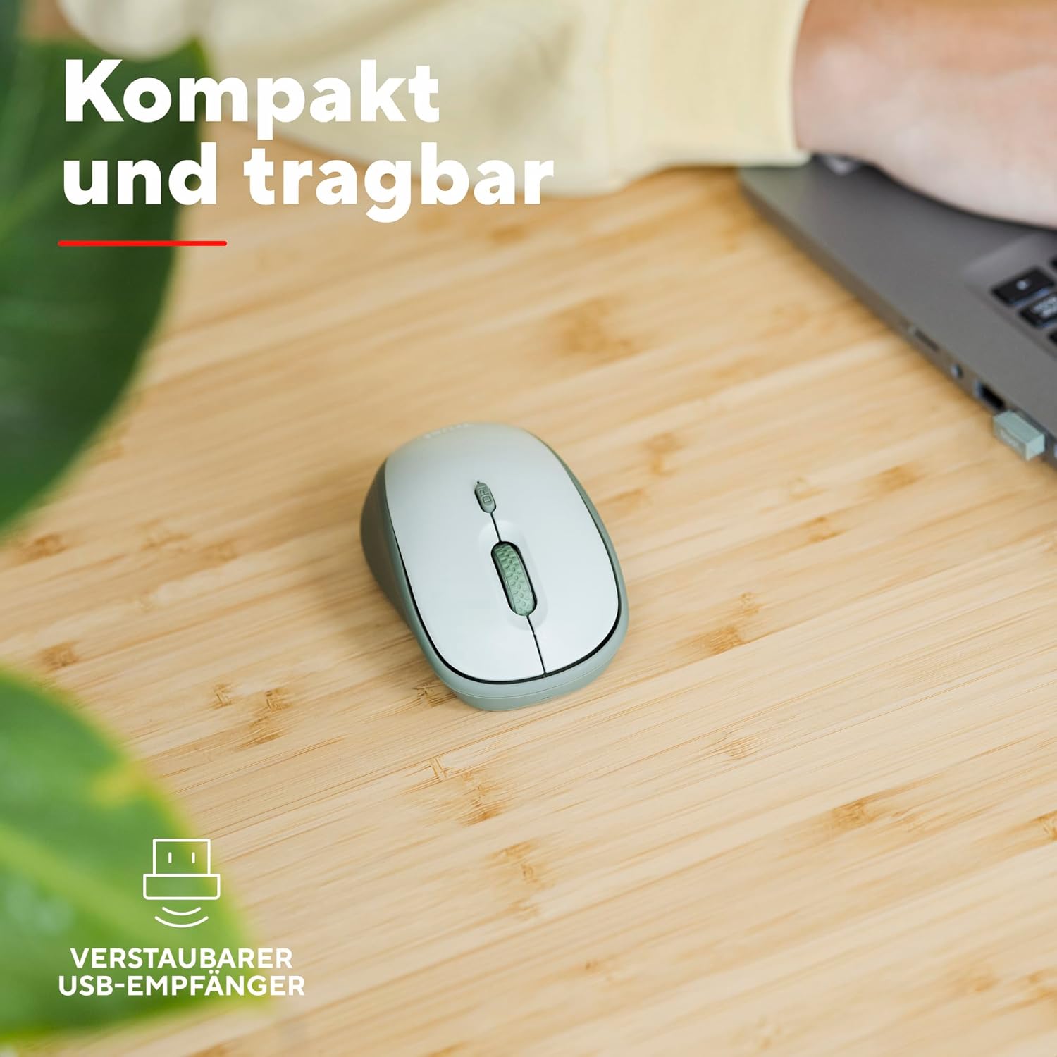 Безжична мишка Trust Yvi+ Quiet, устойчив дизайн, 800-1600 DPI, за десничари и левичари, USB микро приемник с възможност за съхранение, компактна безжична мишка за лаптоп, компютър, настолен компютър, Mac - зелена