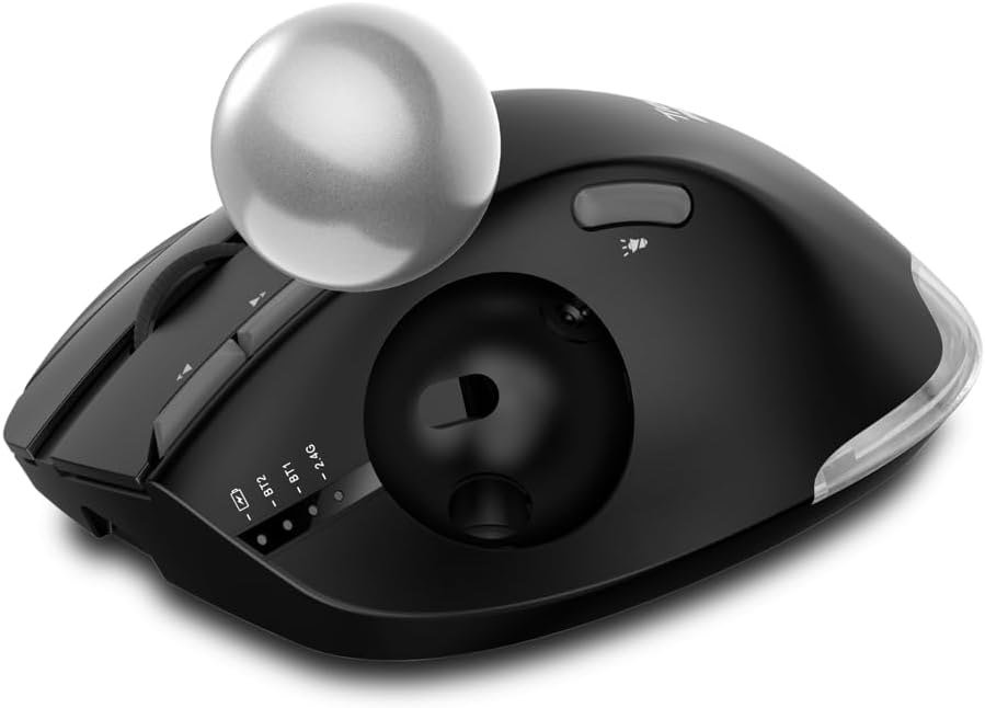 • Ергономична безжична мишка: ергономичната Bluetooth мишка има иновативен регулируем ъгъл и ергономично извит дизайн. Курсорът се управлява от въртенето на тракбола с палеца, което гарантира, че китката и ръката ви няма да се натоварват при продължителна употреба. Бутоните за движение напред и назад осигуряват допълнително удобство и ефективност при ежедневно сърфиране в интернет и редактиране на документи.