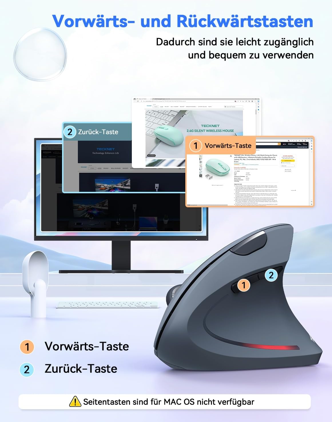 Безжична вертикална ергономична мишка TECKNET, 4800 DPI безжична оптична мишка с 5 бутона, 2.4G USB вертикална ергономична оптична мишка безжична за Windows и Mac OS