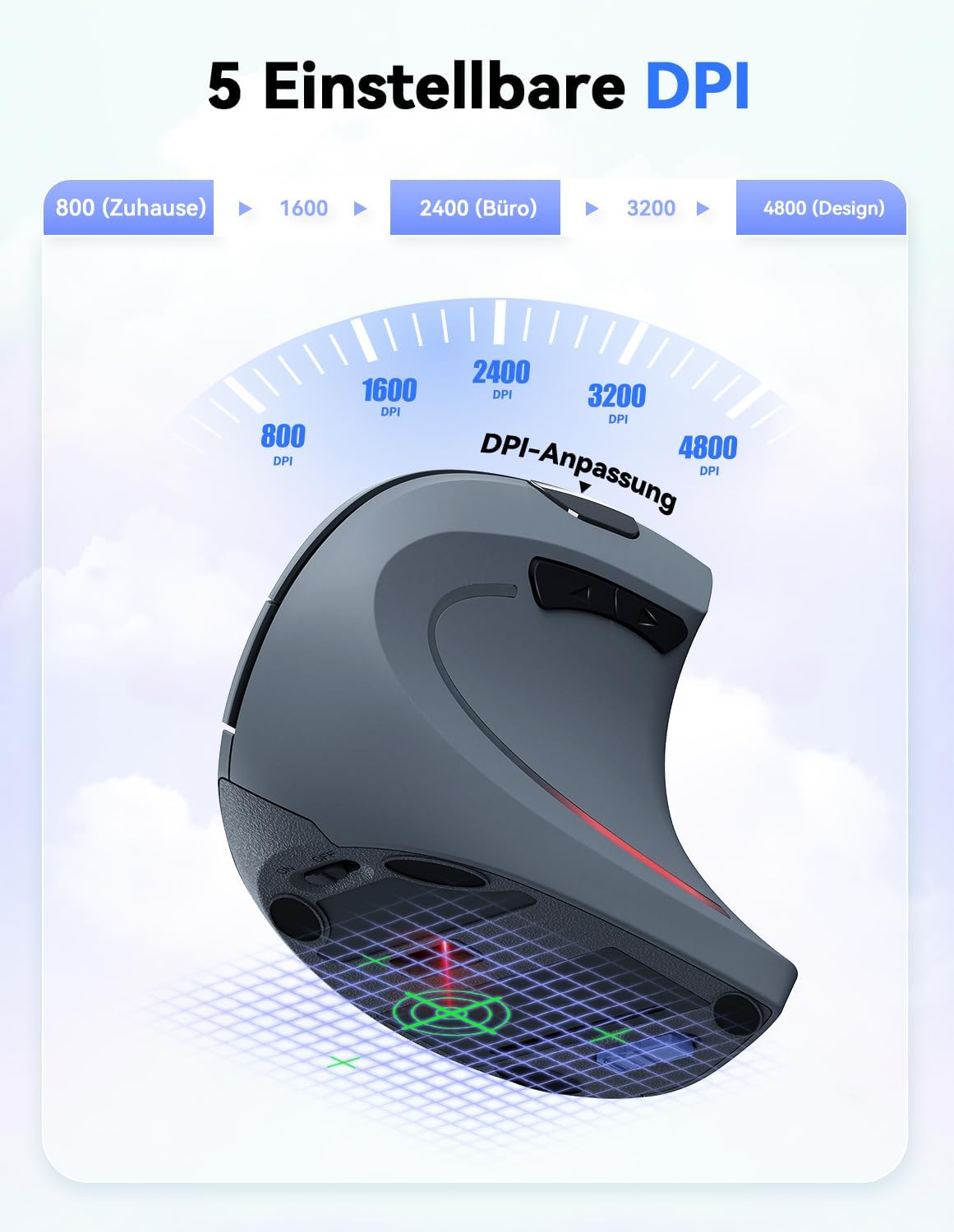 • 【5 регулируеми DPI】Безжична мишка с резолюция 4800/3200/2400/1600/800 DPI. Технологията за оптично проследяване осигурява много по-чувствителност от традиционните оптични мишки, с плавно и прецизно проследяване върху различни повърхности.