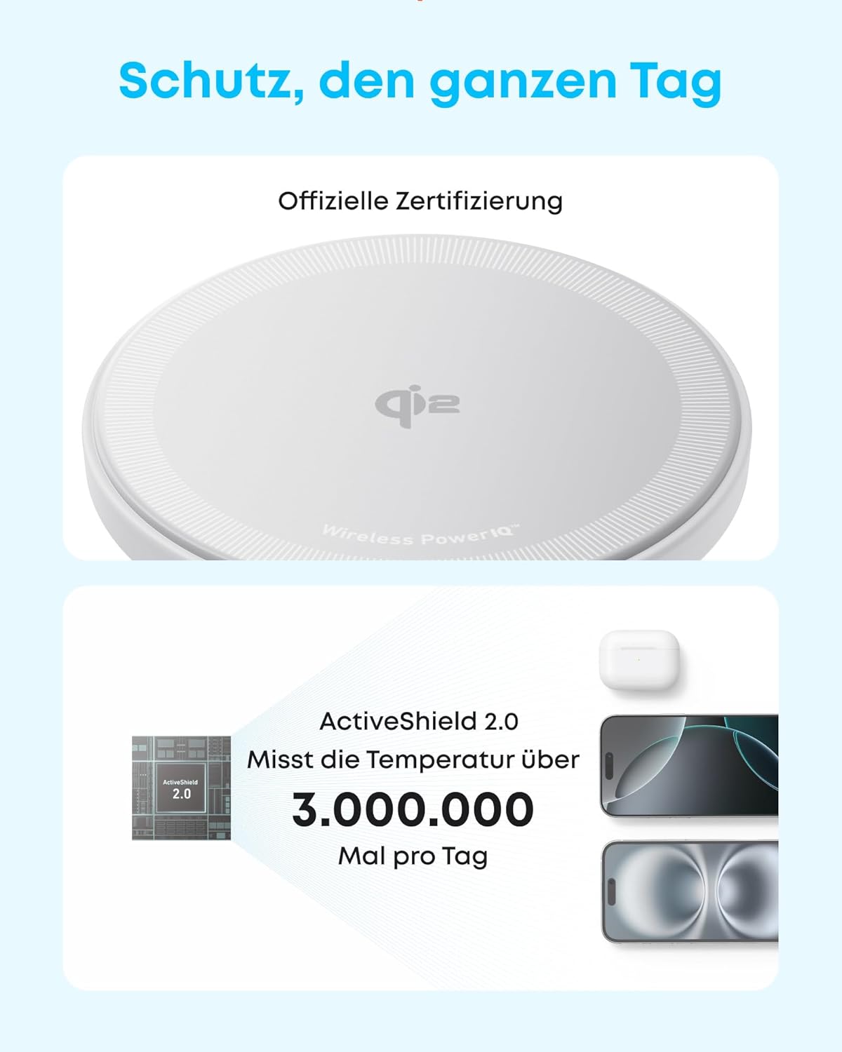 • БЕЗОПАСНО И БЕЗПРИТЕШНО ЗАРЕЖДАНЕ Това сертифицирано Qi2 зарядно устройство е снабдено с нашата система за сигурност ActiveShield 2.0, която измерва температурата 8 милиона пъти на ден за несравнима защита. Благодарение на това интелигентно измерване на температурата и свързаната с нея защита, ефективността на зареждането се подобрява и се поддържа здравето на батерията на вашия мобилен телефон.