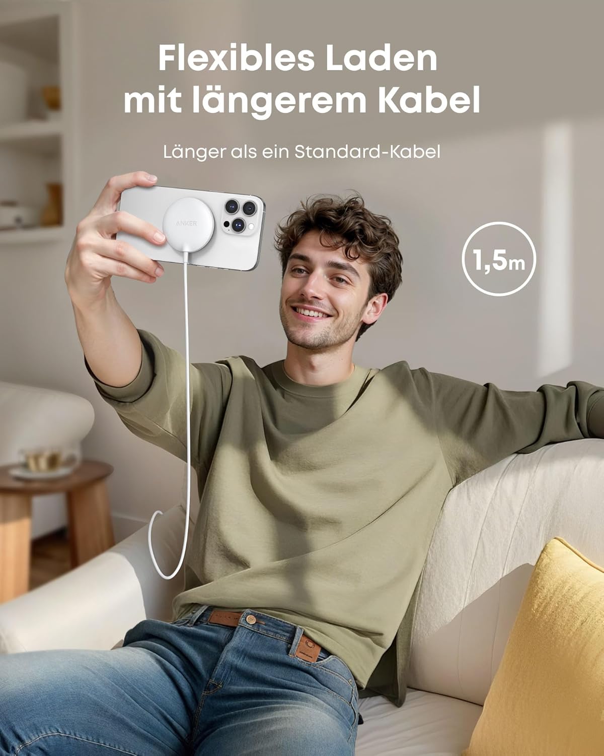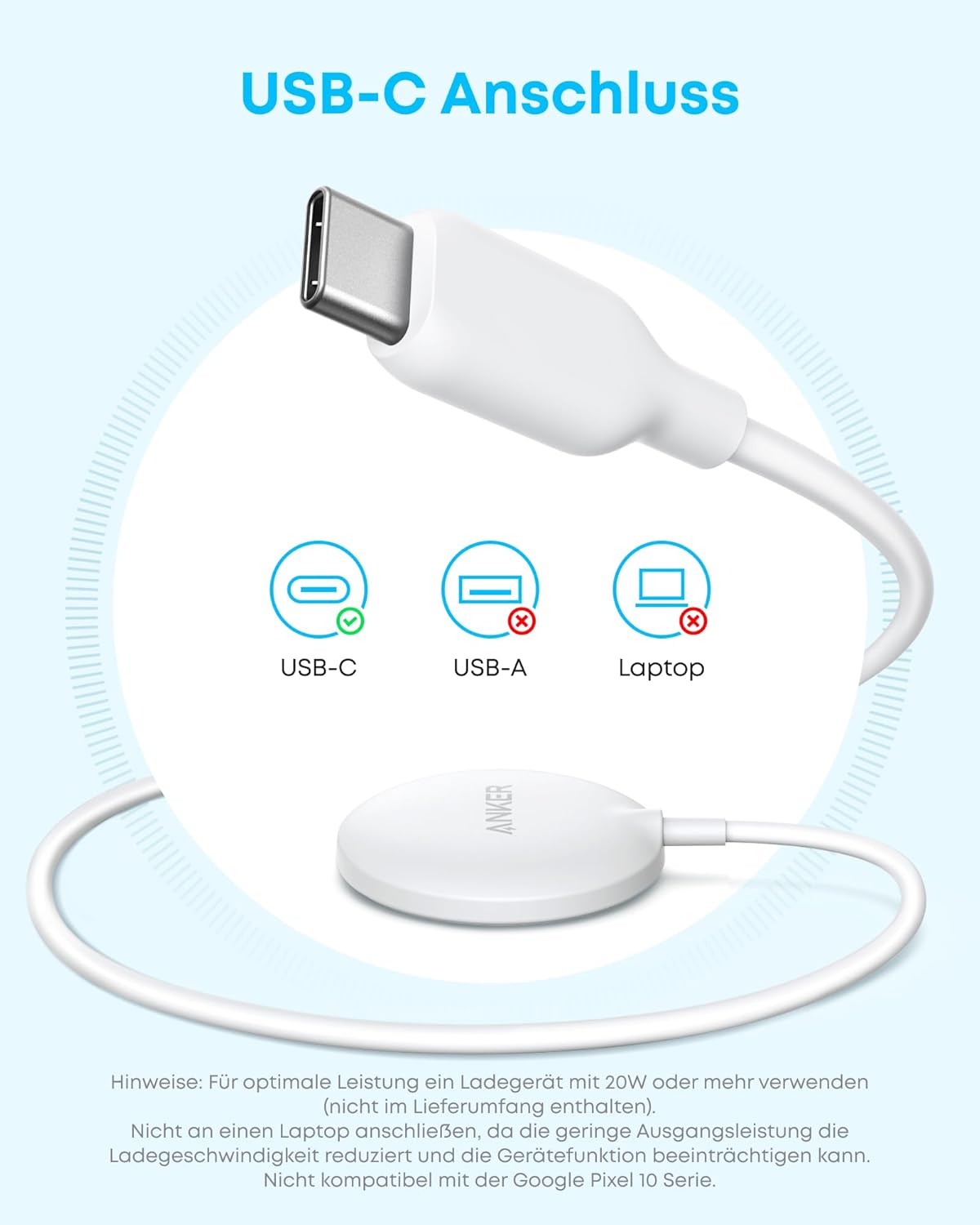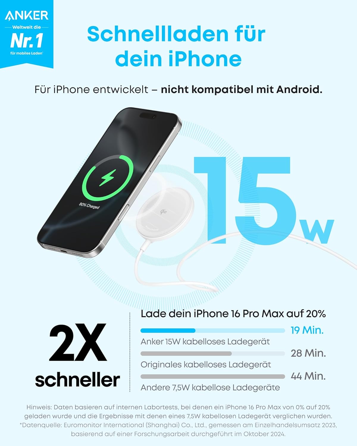Безжична зарядна подложка Anker Zolo Magnetic, Qi2 сертифицирана, 15W, съвместима с MagSafe, за iPhone 17/16/15/14/13 серия, AirPods и др. (Не е за Pixels, без захранване)