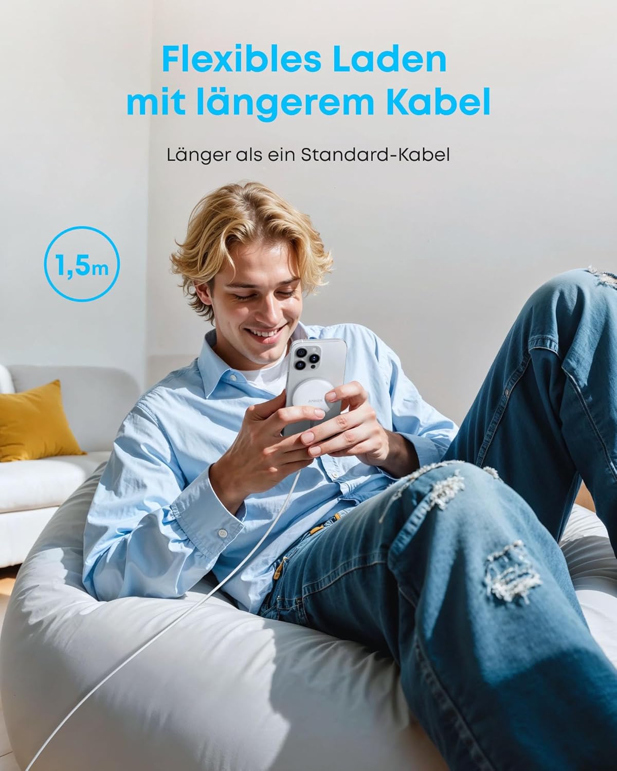 • Изключително дълъг кабел: С този кабел с дължина 1,5 м сте гъвкави и можете да се движите повече по време на зареждане. Той ви предлага достатъчен обхват, за да зареждате телефона си без ограничения - независимо дали у дома или на работа. Така че можете да сърфирате, да проверявате имейлите си или да осъществявате разговори, без да бъдете ограничени от твърде къс кабел.