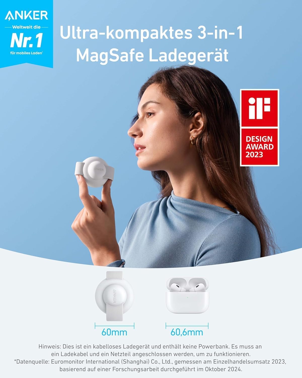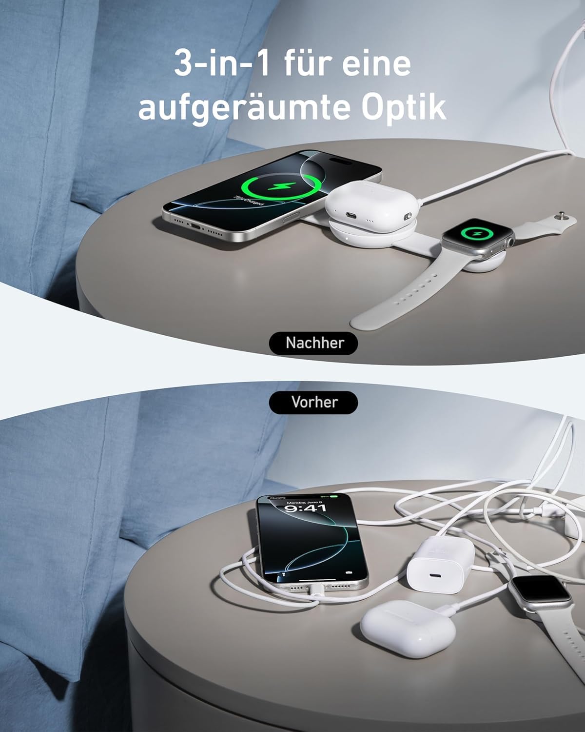 • Удобно за пътуване и супер удобно (с щепсел за ЕС/САЩ/Великобритания): Сгъваемото 3-в-1 зарядно устройство с Qi2 е с размерите на топка, така че можете лесно да зареждате безжично в движение.