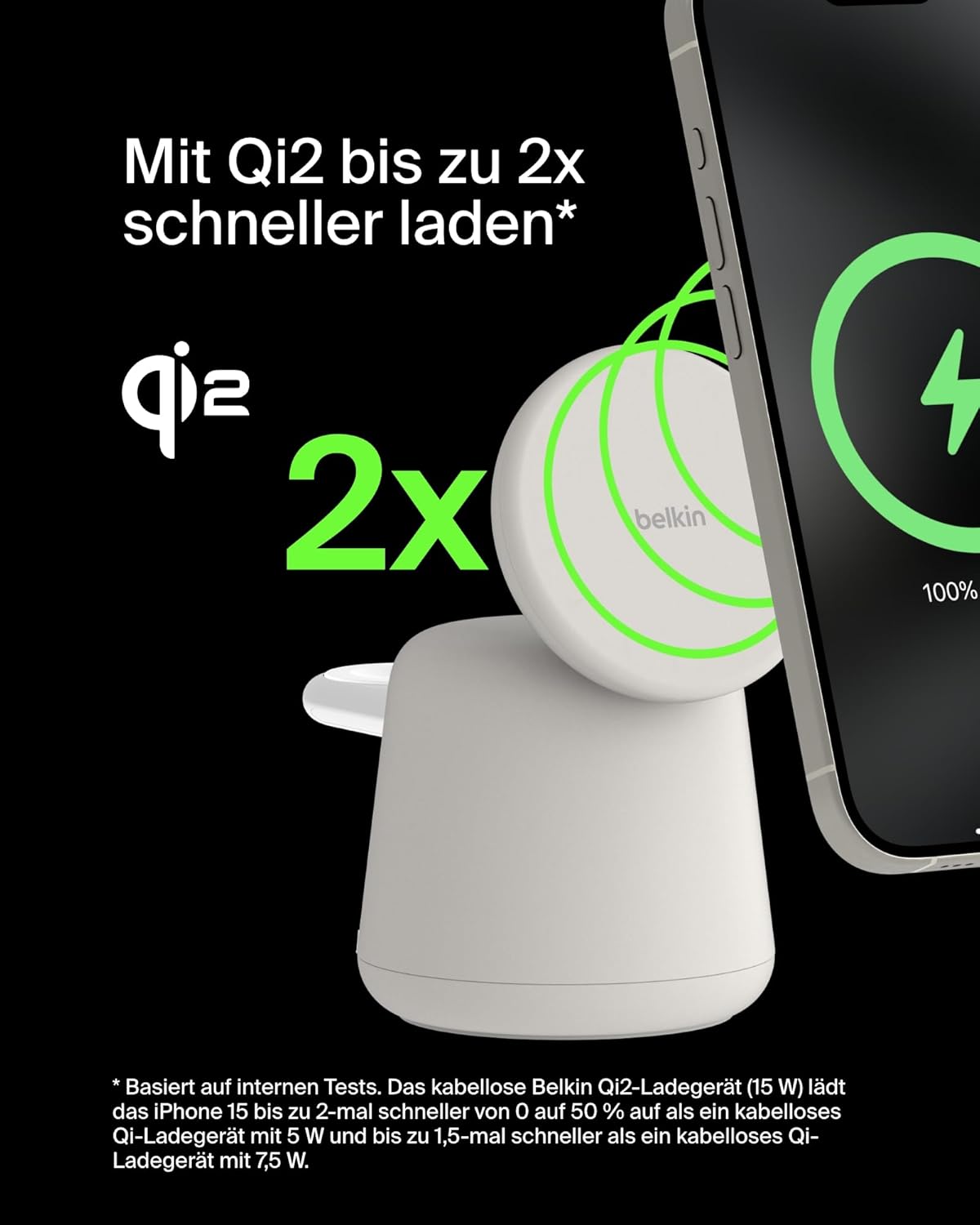 Безжична зарядна станция Belkin BoostCharge Pro 2 в 1 с Qi2, 15W, съвместима с MagSafe за iPhone 17, Air, Pixelsnap, Apple Watch, AirPods, други Qi2 устройства - Включва захранване - пясъчнозелена