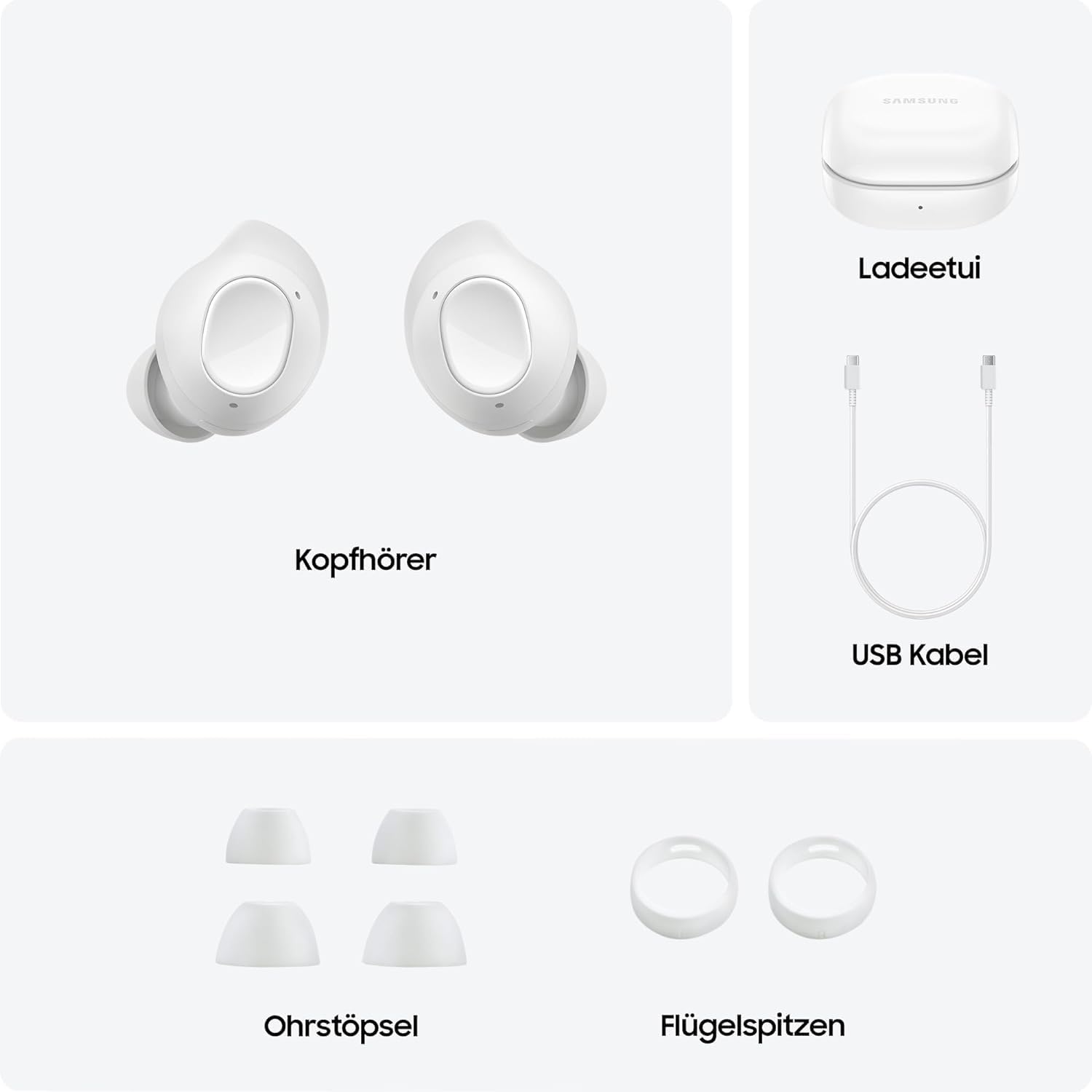 Безжични Bluetooth слушалки Samsung Galaxy Buds FE, активно шумопотискане (ANC), удобно прилягане, 3 микрофона, сензорно управление, дълбок бас, включва кабел за зареждане, бели