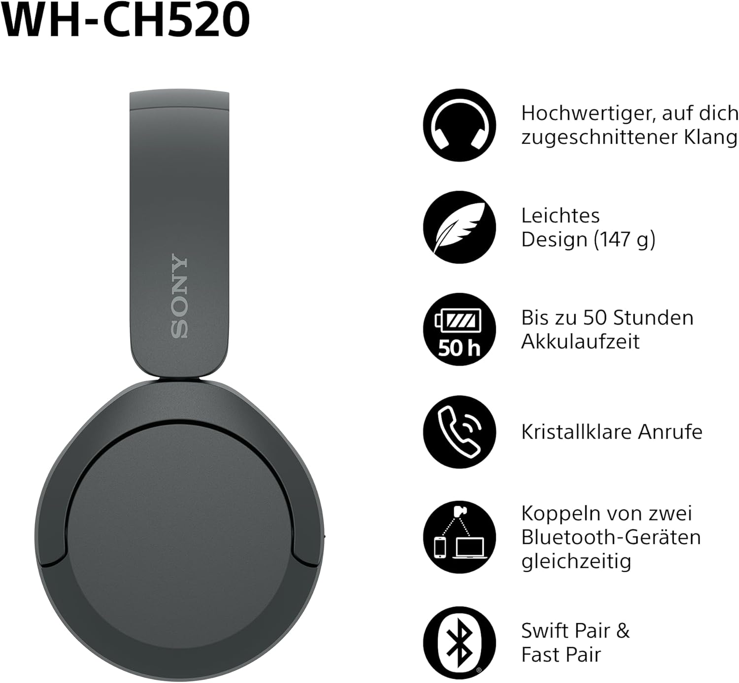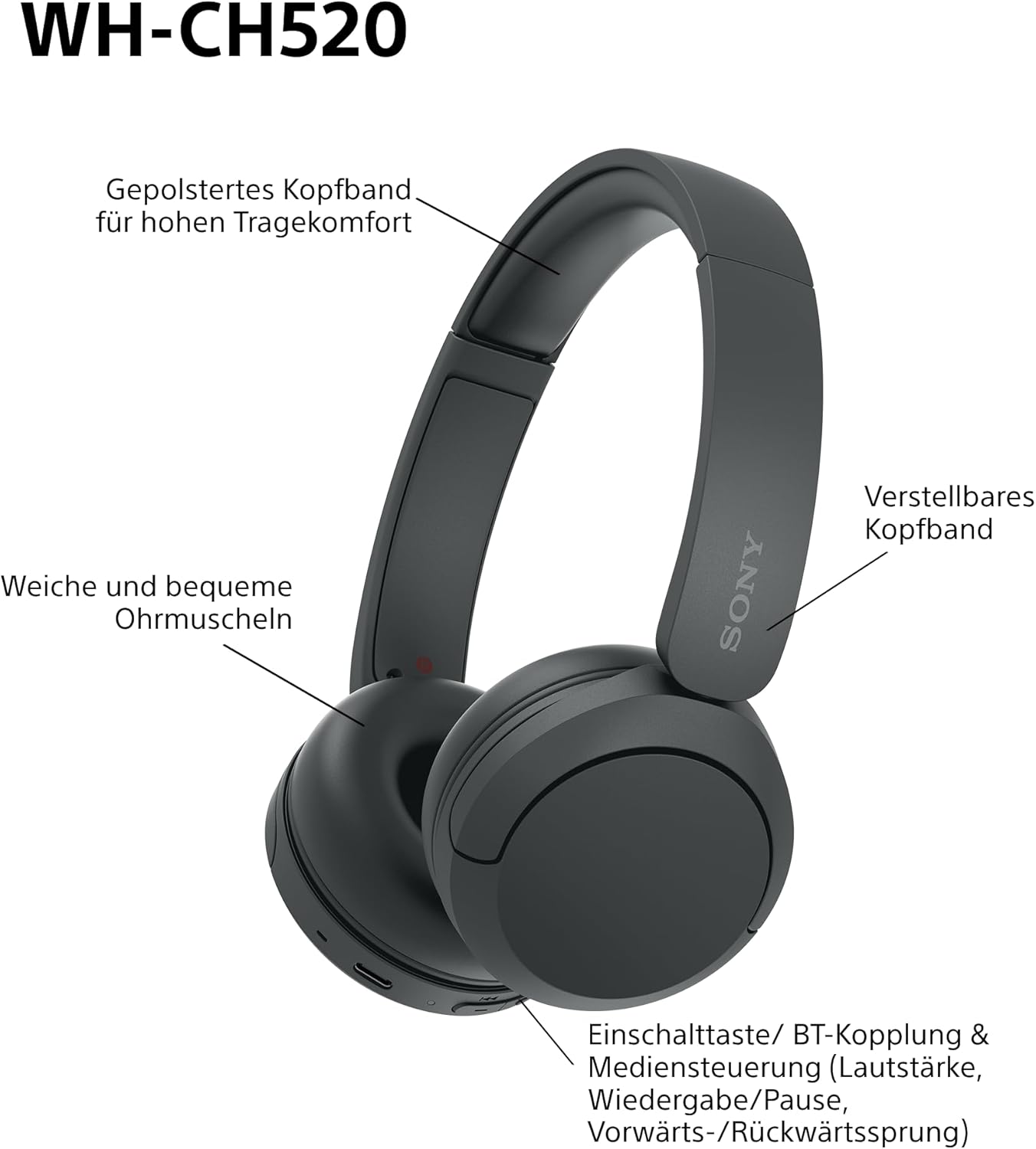 Безжични Bluetooth слушалки Sony WH-CH520 - до 50 часа живот на батерията с функция за бързо зареждане, модел за носене на ушите - черни