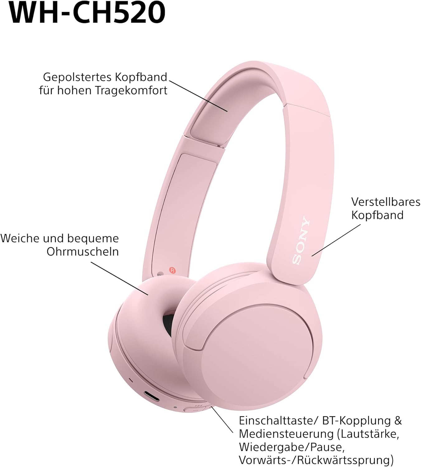 Безжични Bluetooth слушалки Sony WH-CH520, високо качество на звука, лек дизайн, живот на батерията до 50 часа, бързо зареждане, еквалайзер, ясно качество на разговорите, iOS и Android - розови