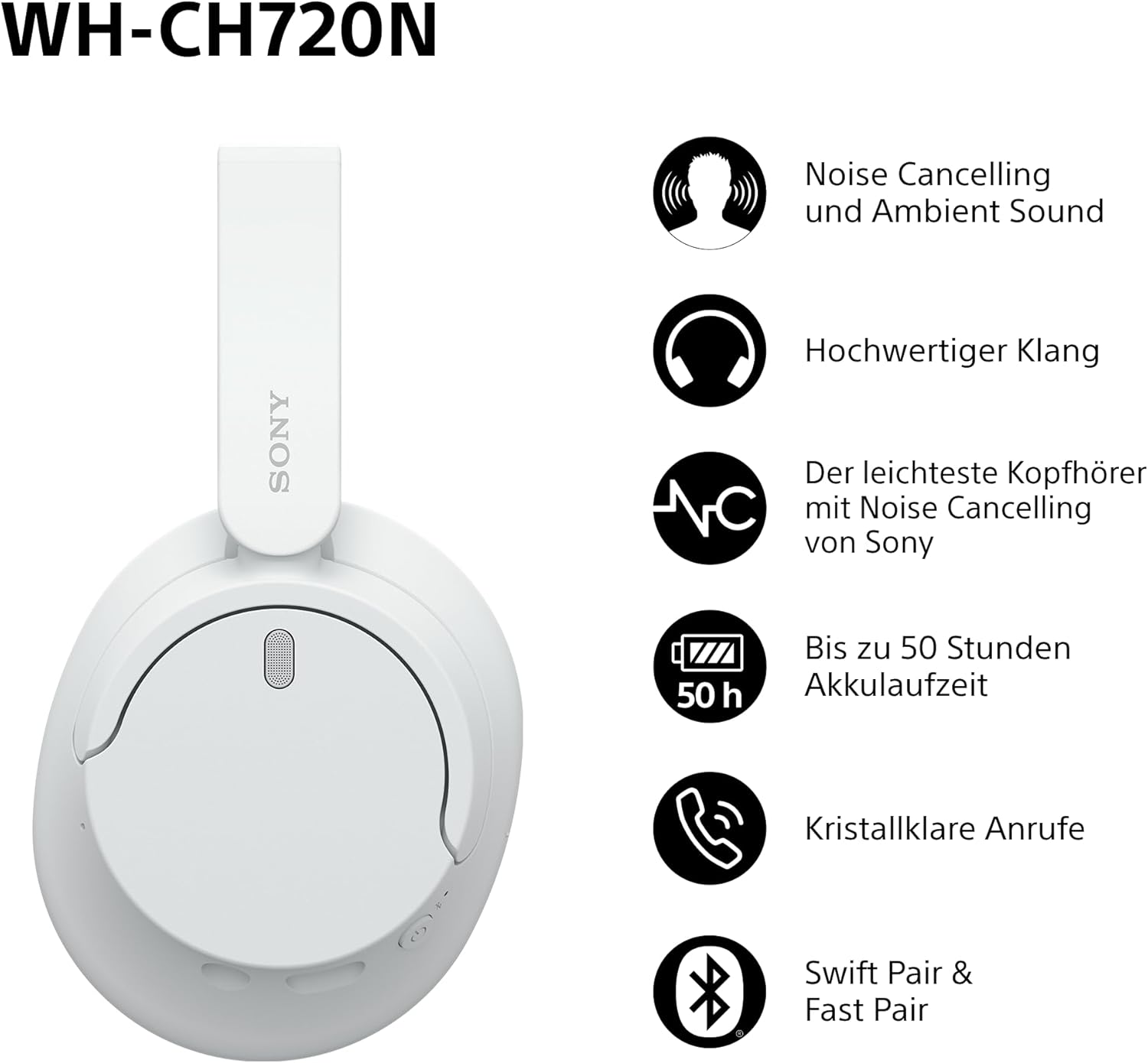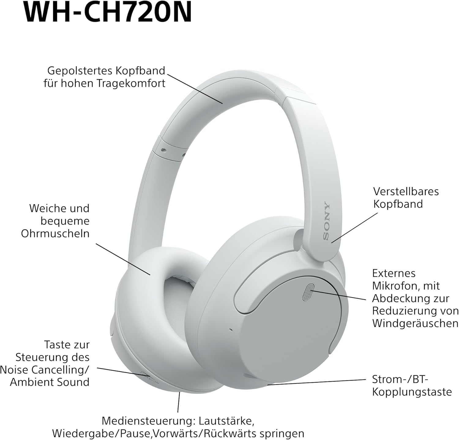 Безжични Bluetooth слушалки Sony WH-CH720N с шумопотискане - до 35 часа живот на батерията и функция за бързо зареждане - бели