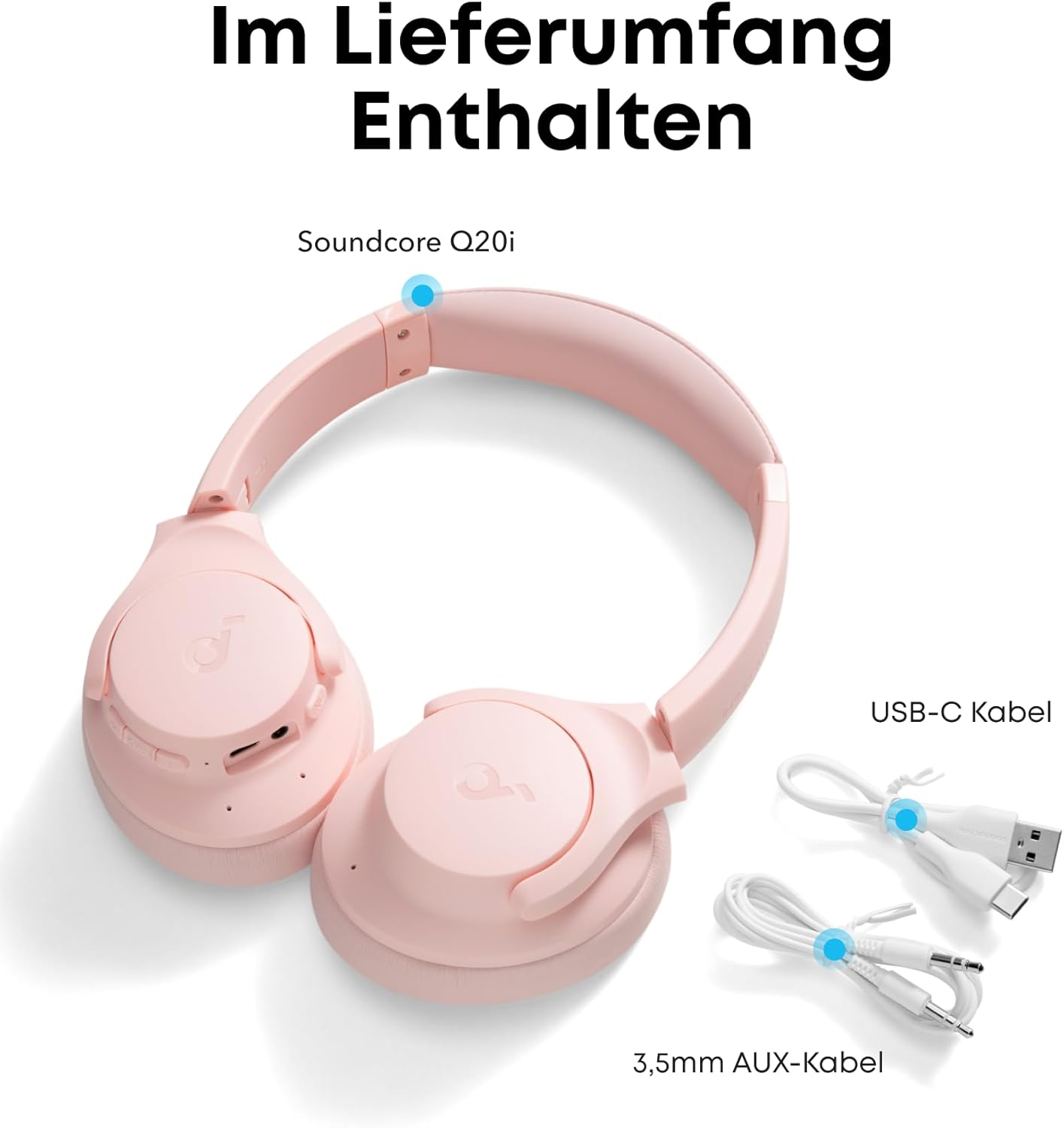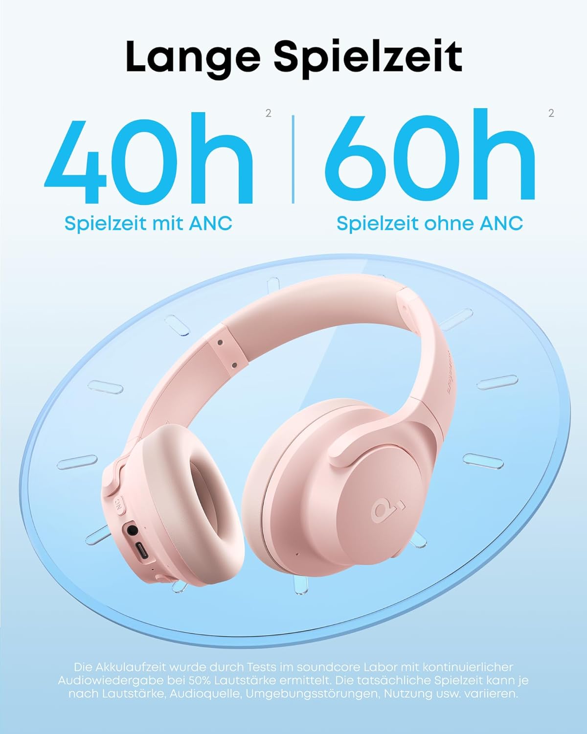 Безжични Bluetooth слушалки Soundcore by Anker Q20i с хибридно активно шумопотискане, 40 часа време за възпроизвеждане в ANC режим, Hi-Res аудио, дълбок бас, персонализиране на приложения (розови)