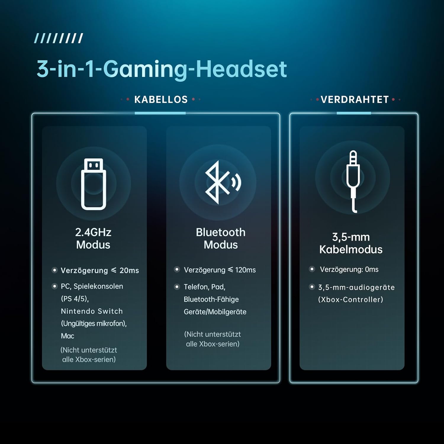 • 3-в-1 свързаност и поддръжка на повече устройства: 2.4 GHz режимът на геймърските слушалки за компютър е съвместим с PC, PS4, PS5 и Switch. Bluetooth режимът на слушалките за Xbox поддържа мобилни телефони, таблети и Mac. 3.5 мм кабелният режим на слушалките за PS5 е съвместим с Xbox One/Xbox Series и мобилни устройства (не всички модели на Xbox поддържат безжичен режим).
