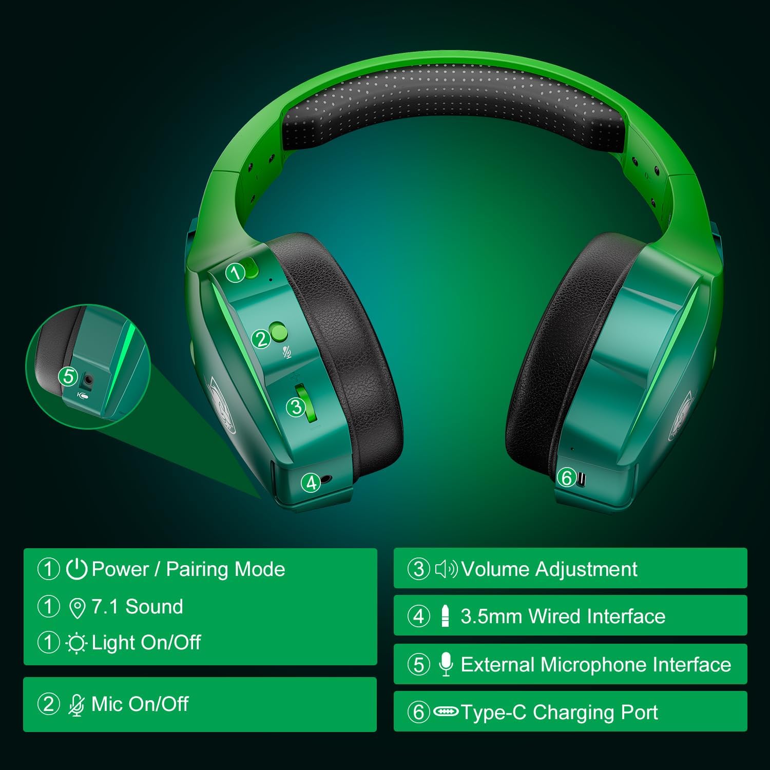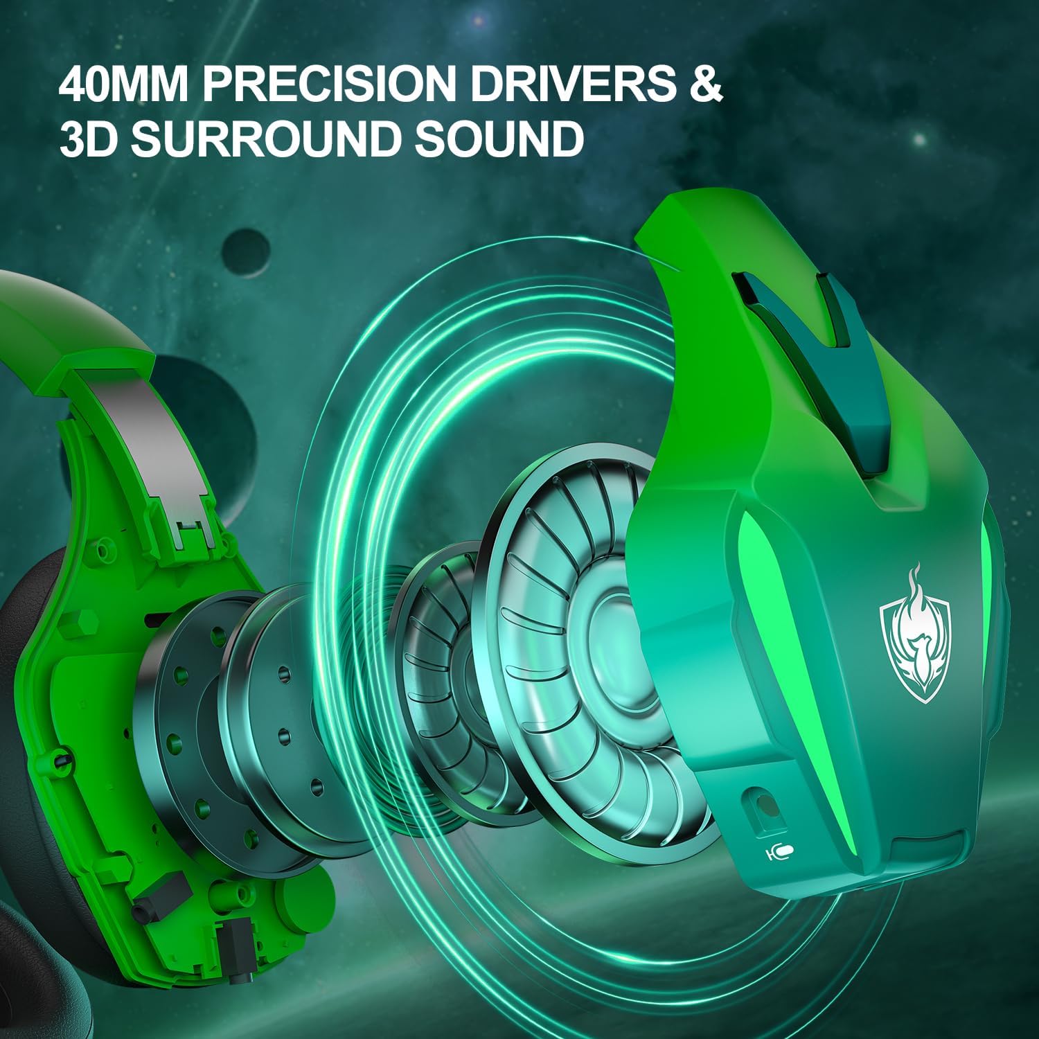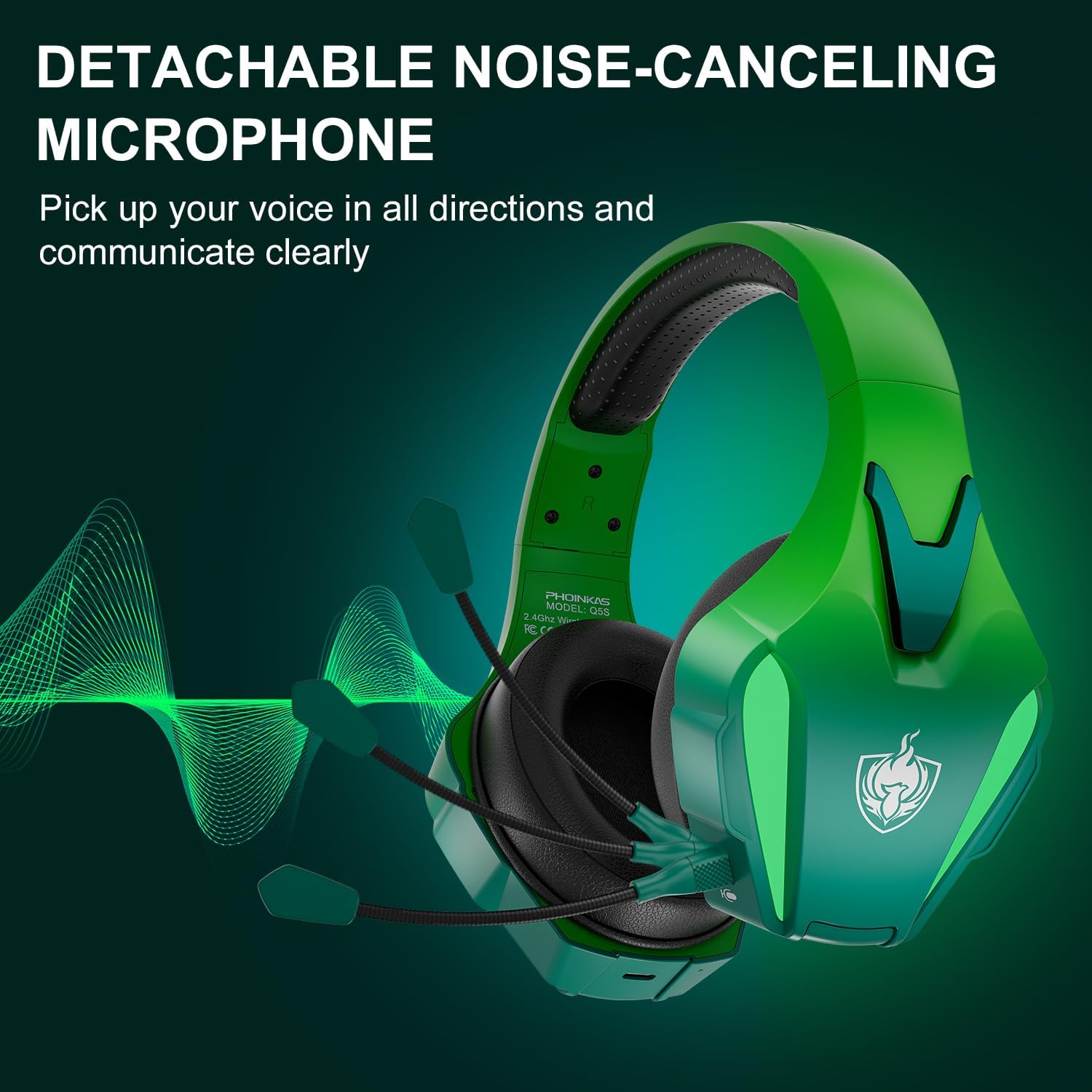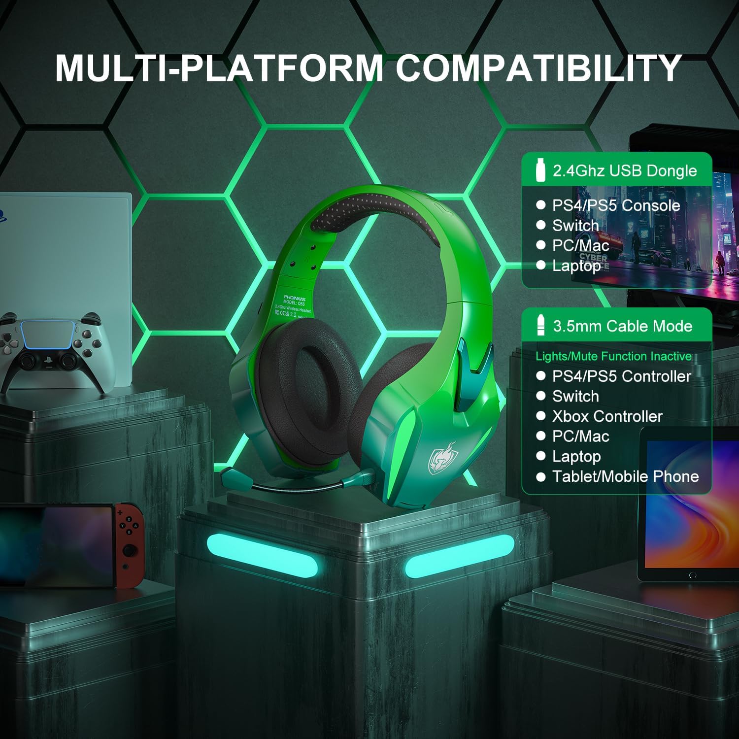 Безжични геймърски слушалки PHOINIKAS, 2.4 GHz геймърски слушалки за PS5, PS4, PC, 7.1 стерео геймърски слушалки с микрофон, 3.5 мм кабел за Xbox / Switch / лаптоп / Mac (ослепително зелено)