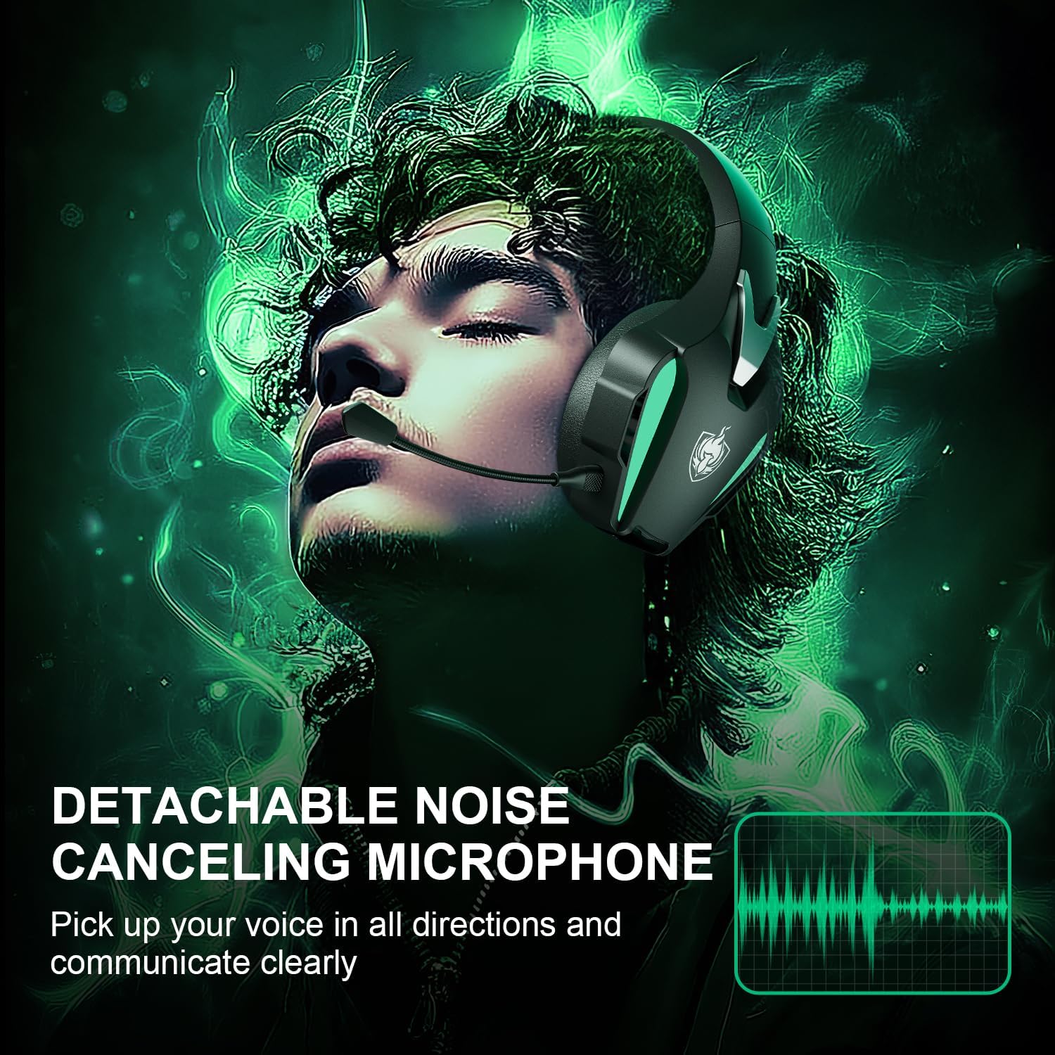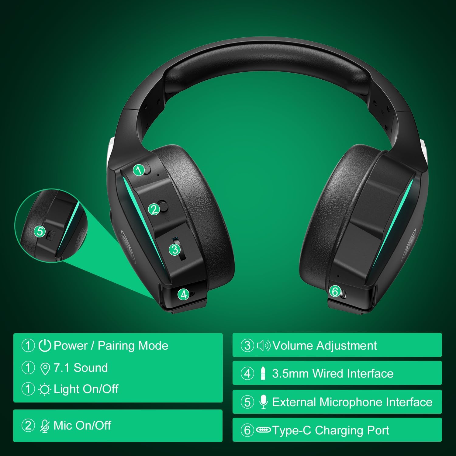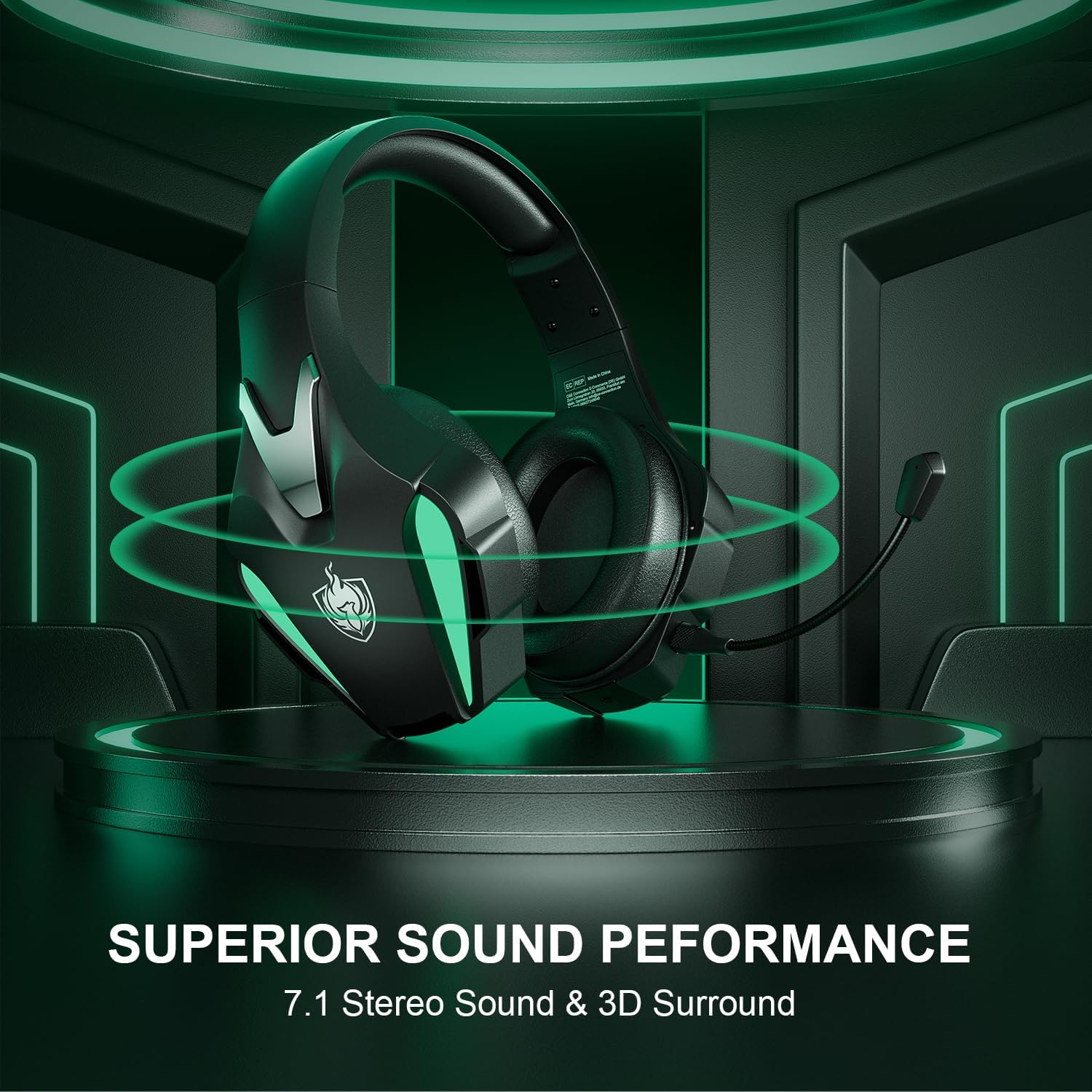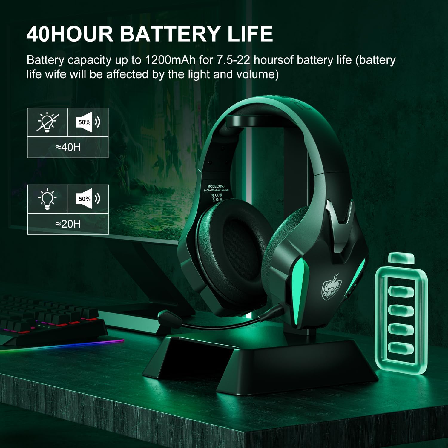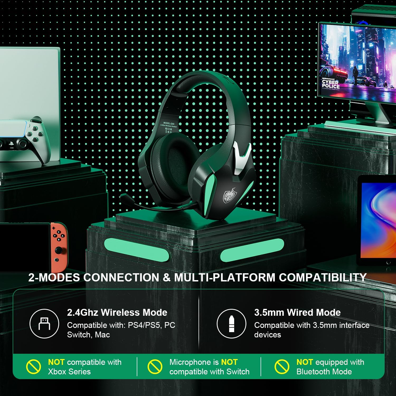 Безжични геймърски слушалки PHOINIKAS, 2.4 GHz геймърски слушалки за PS5, PS4, PC, 7.1 стерео геймърски слушалки с микрофон, 3.5 мм кабел за Xbox / Switch / лаптоп / Mac (зелени)
