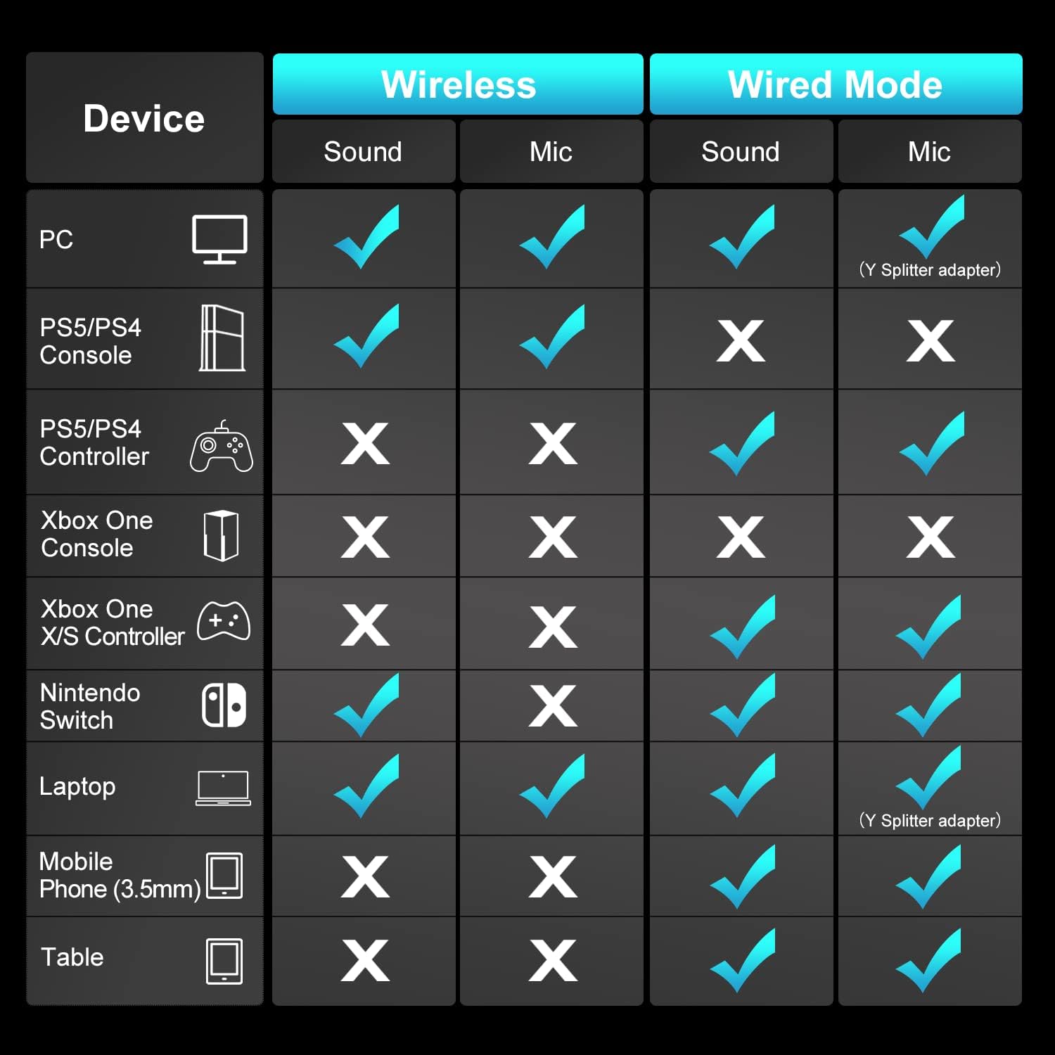 • Съвместимост с множество платформи: геймърски слушалки с 2.4GHz USB & Type C двоен адаптер и 3.5mm кабел, нашите геймърски слушалки са съвместими с PS4/PS5/PC/Switch/мобилен телефон. Просто включете устройството си и можете да се насладите на завладяващо и комфортно игрово изживяване по всяко време и навсякъде.