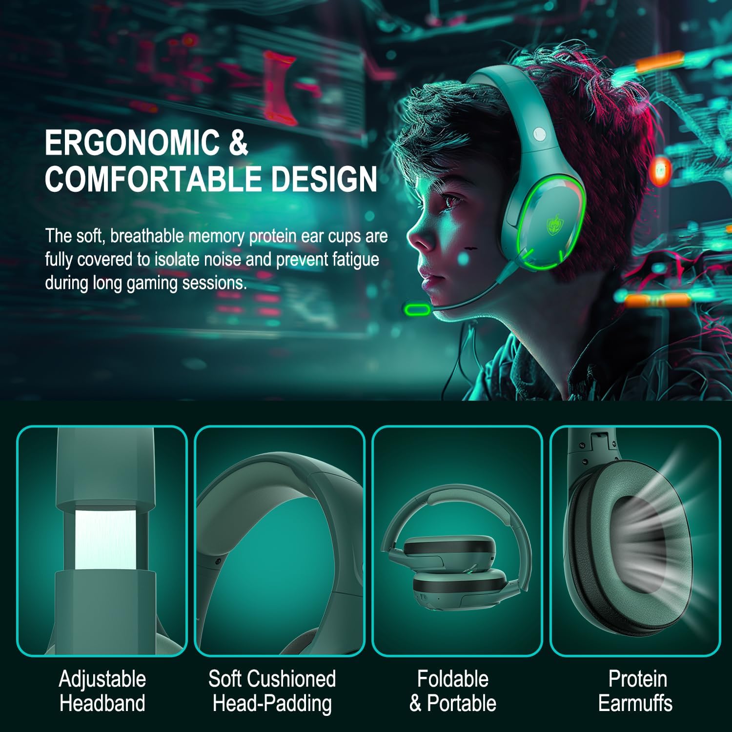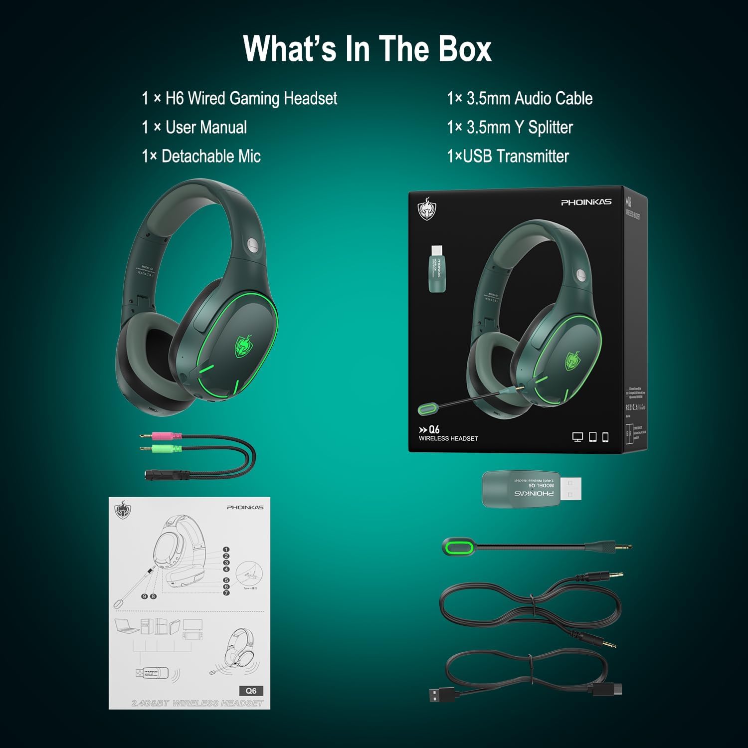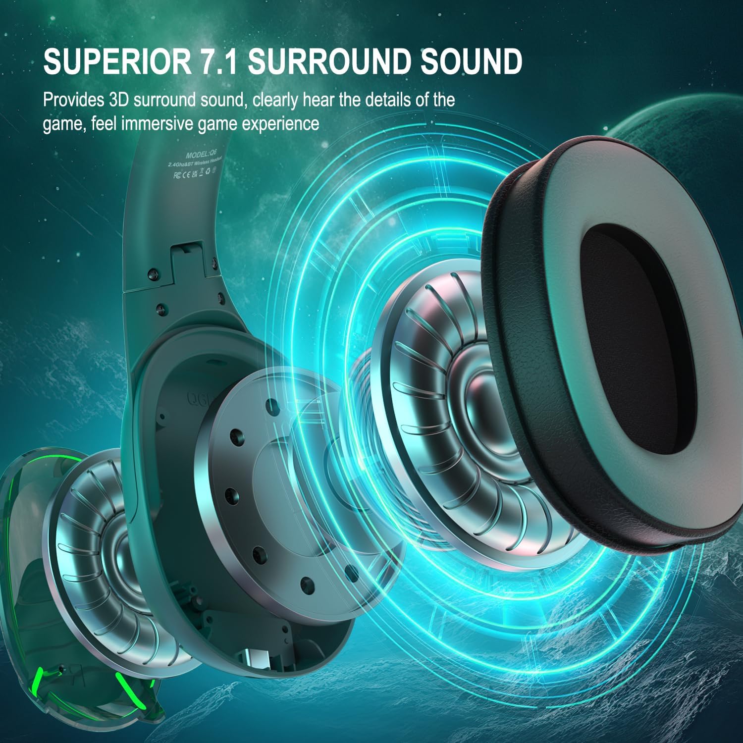 Безжични геймърски слушалки PHOINIKAS, Bluetooth слушалки с два чипа, Bluetooth 5.3 за мобилен телефон/лаптоп, 2.4 GHz адаптер за компютър/PS4/PS5/TV/Switch, микрофон с шумопотискане, 30 часа живот на батерията, LED