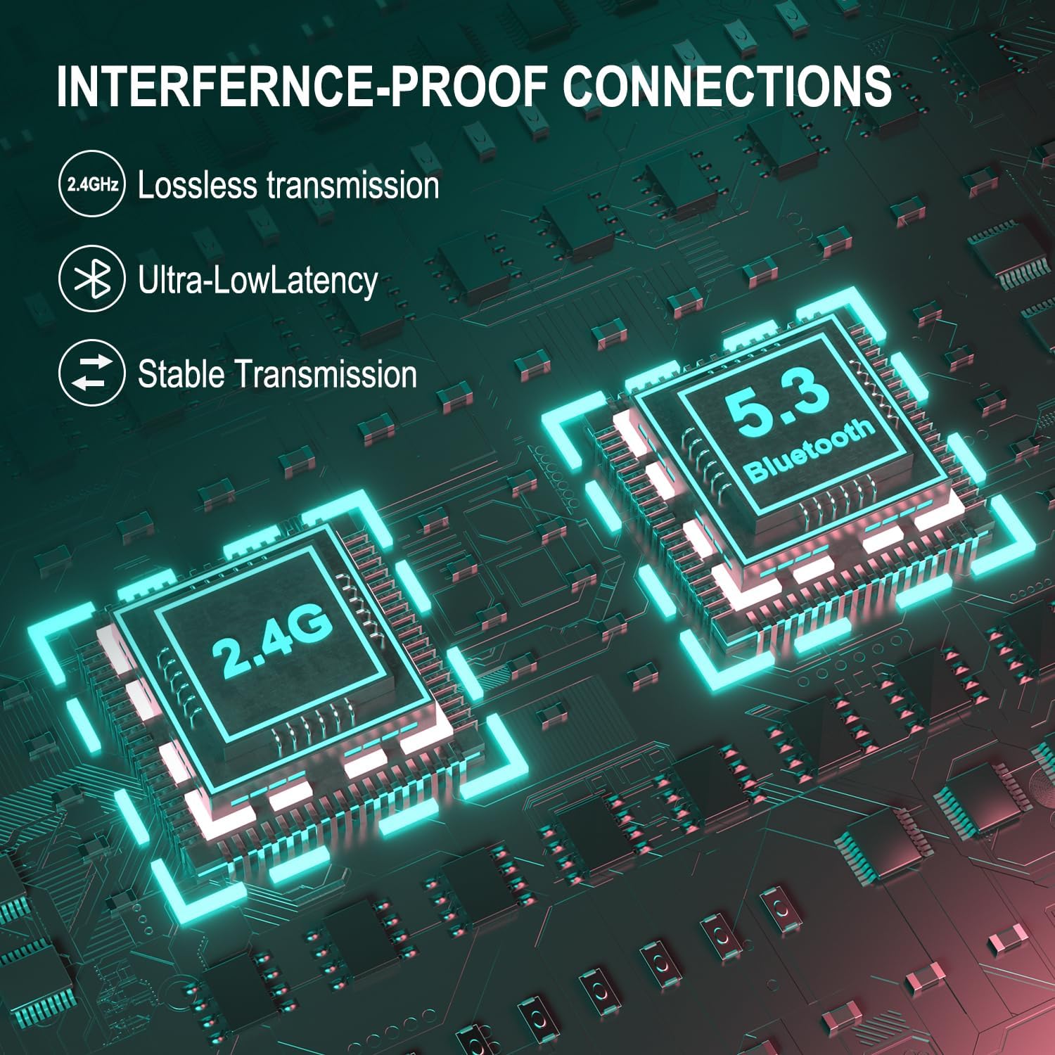 • ИЗКЛЮЧИТЕЛНО СТАБИЛНА ВРЪЗКА Безжичните слушалки се свързват чрез 2.4GHz USB предавател с ултраниска латентност за звук в реално време по време на игра. Латентността е по-малка от 25 милисекунди, така че можете да се наслаждавате на по-плавна работа.