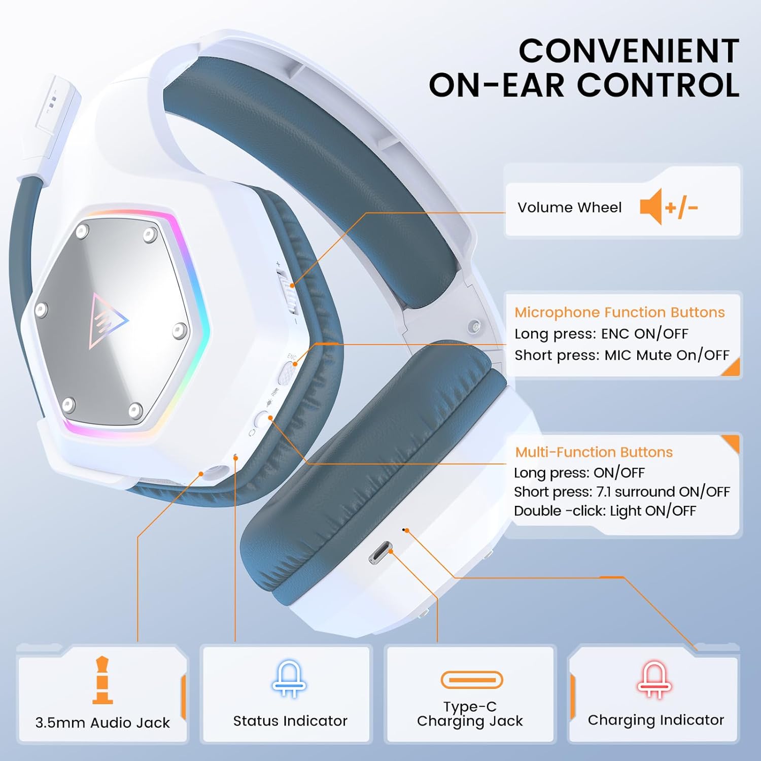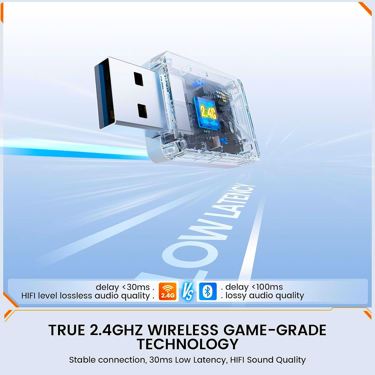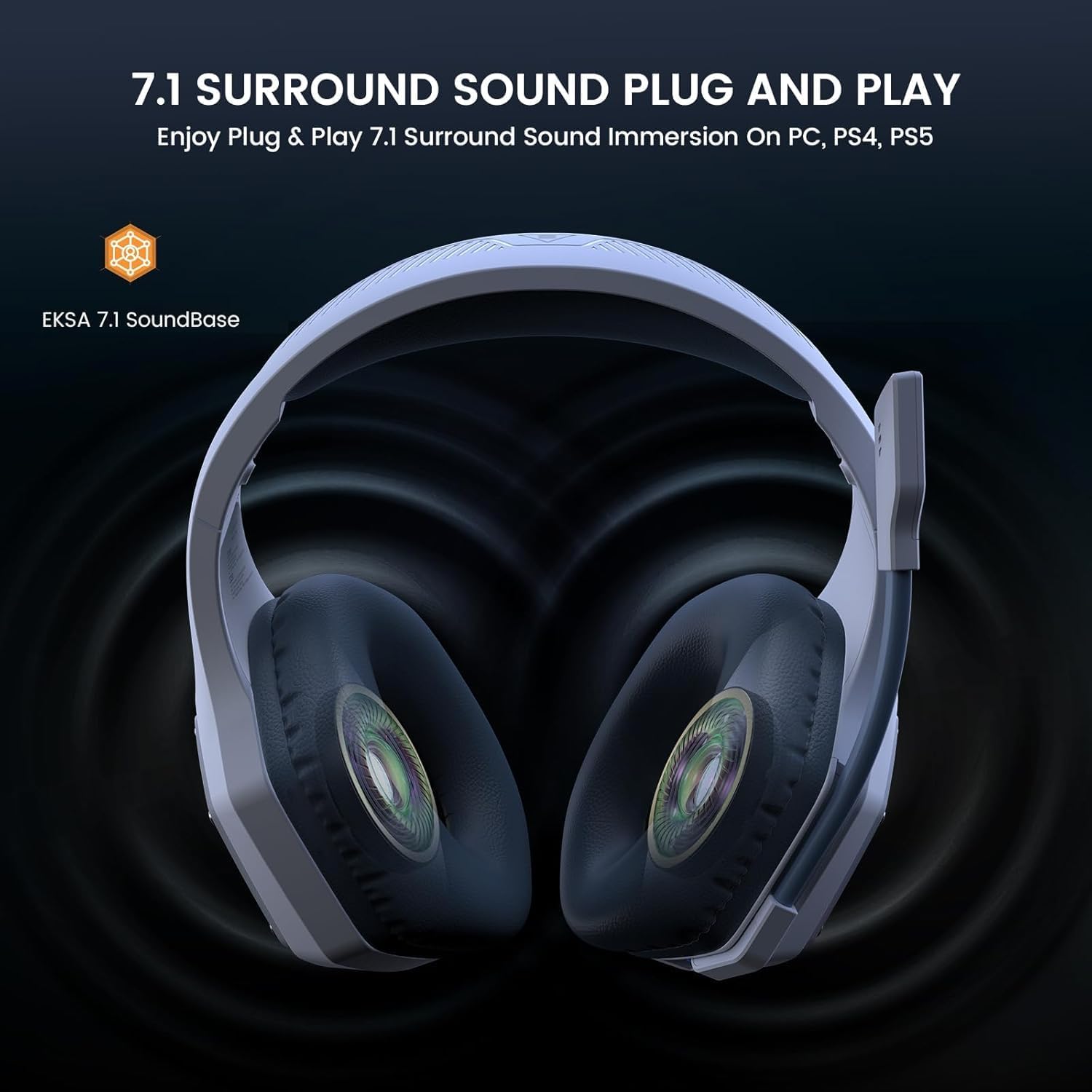 Безжични слушалки EKSA с микрофон, 2.4 GHz USB Dongle, 7.1 съраунд звук, ясна позиция на слушане, ENC и RGB геймърски слушалки, 36 часа живот на батерията за PC, PS4, PS5