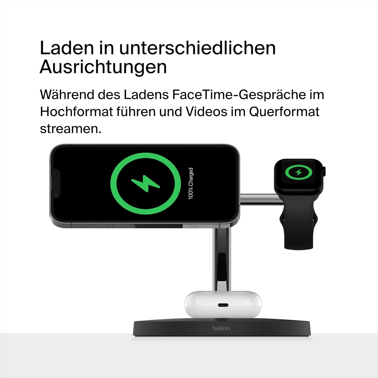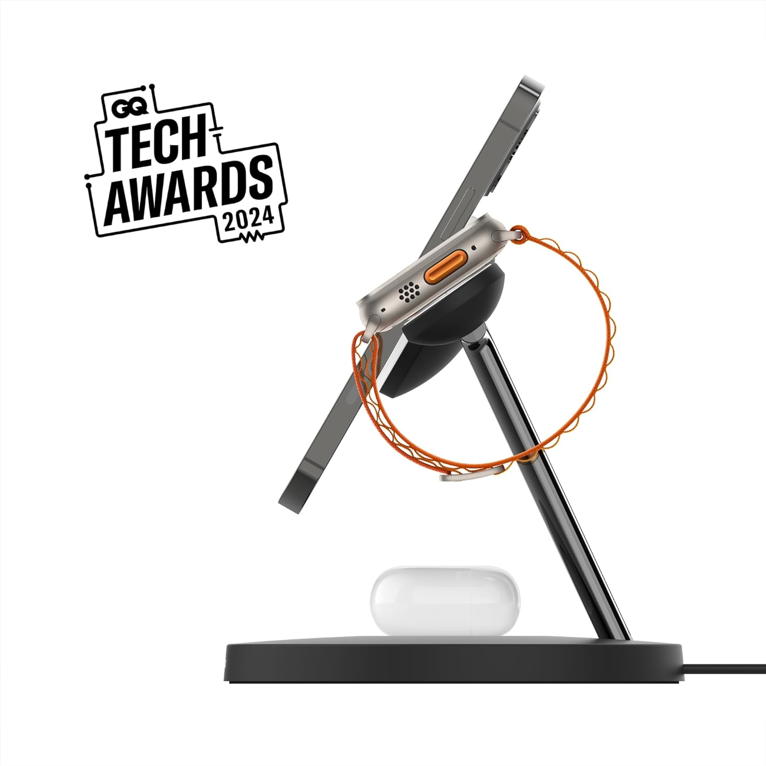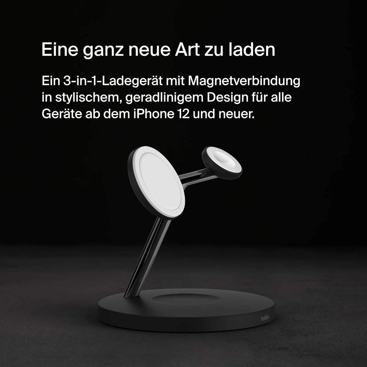 Безжично зарядно Belkin MagSafe 3 в 1, Зарядна станция MagSafe 15W бързо зареждане за iPhone и AppleWatch, Зарядна станция за AirPods за iPhone 16, 15, 14, 13, Apple Watch, AirPods