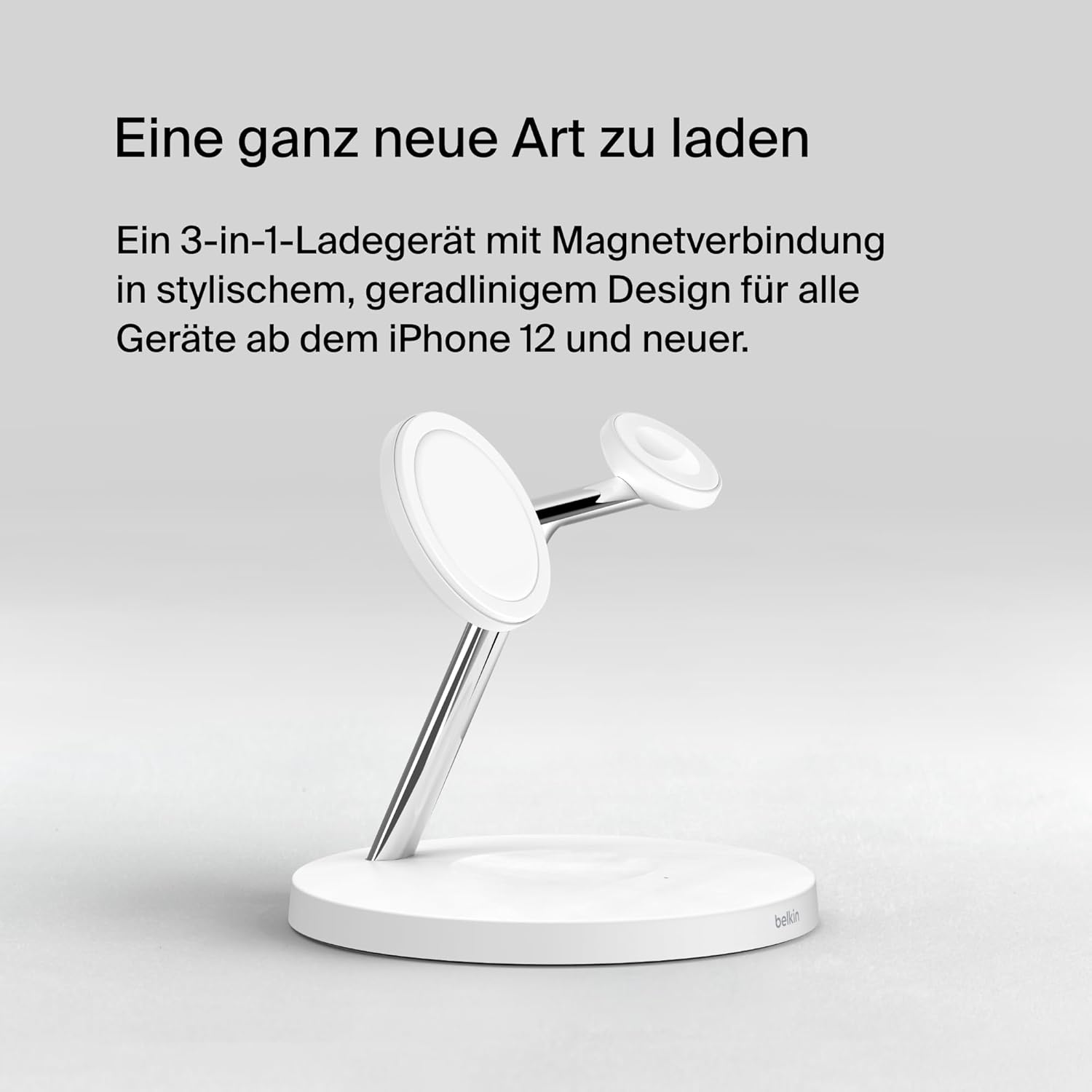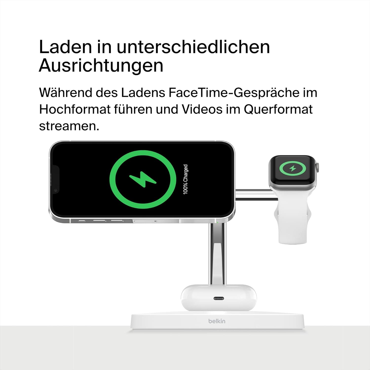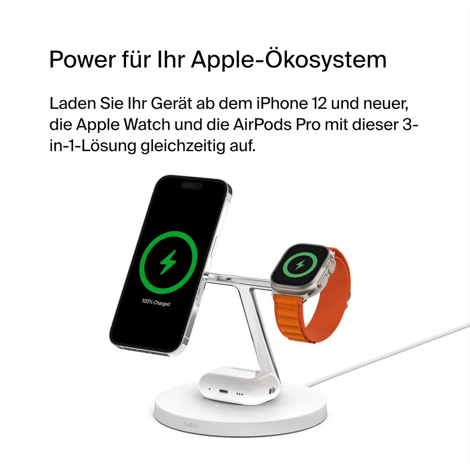 Безжично зарядно Belkin MagSafe 3 в 1, Зарядна станция MagSafe 15W бързо зареждане за iPhone и AppleWatch, Зарядна станция за AirPods за iPhone 16, 15, 14, 13, Apple Watch, AirPods