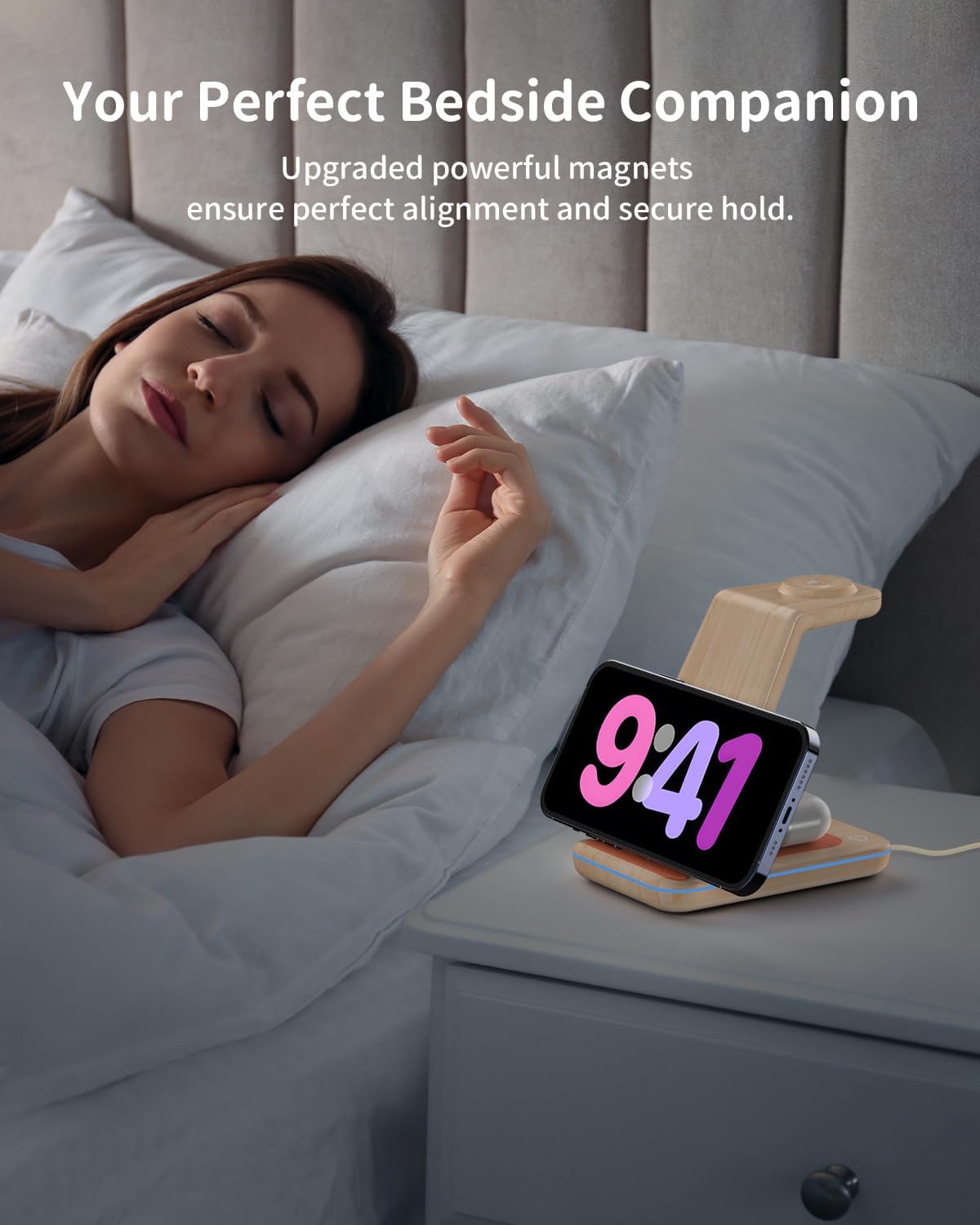 The indicator light of the iPhone charging station flashes when a power source is connected. Simply place the devices on the wireless charging pad to start charging. The corresponding light lights up and then turns off automatically within 20 seconds.
